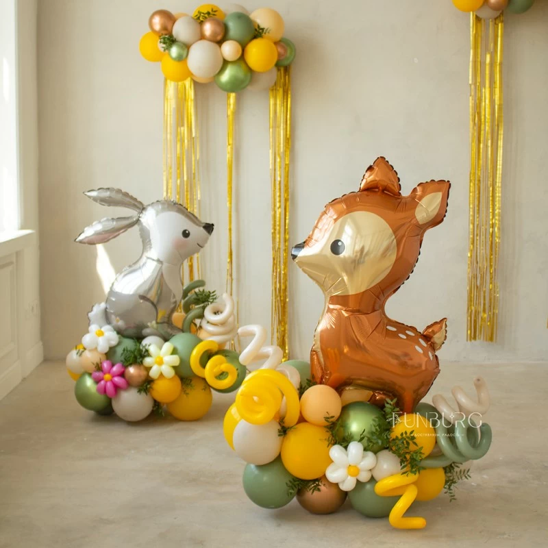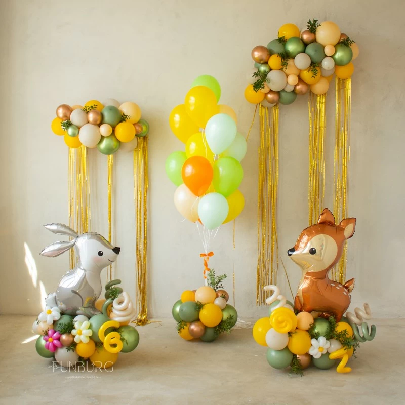 Базовый состав включает в себя такое количество элементов оформления, которого будет достаточно для лаконичного оформления небольшого помещения или фотозоны, но вы можете самостоятельно или при консультации с нашим менеджером регулировать количество и состав элементов, увеличивая или уменьшая их. А также вы можете выбрать другие цвета, и мы изготовим оформление исходя из ваших пожеланий. Фигурки с оленёнком и зайчиком можно заказать отдельно в качестве подарка или элемента оформления.