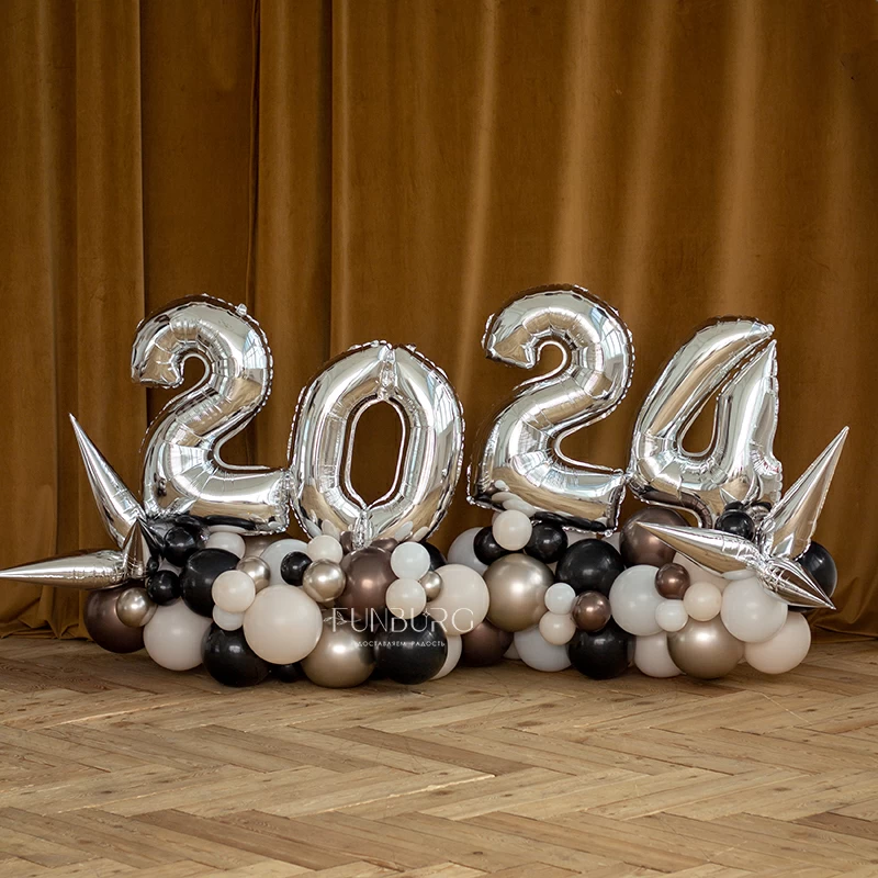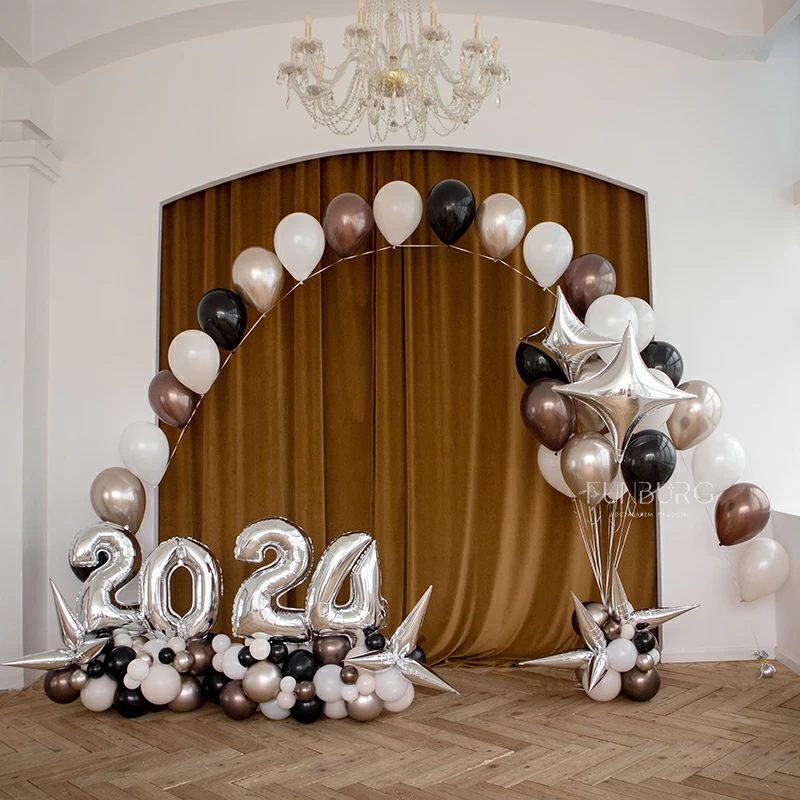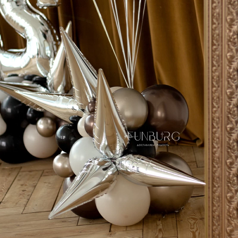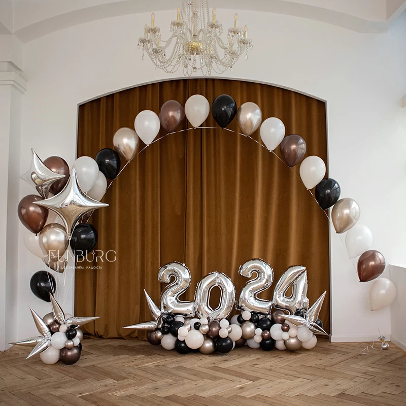 В этом готовом комплексном оформлении есть всё необходимое для стильного и лаконичного украшения достаточно большого пространства, например, сцены: здесь классическая арка из гелиевых шаров (простых и Chrome), красивый фонтан из шариков с звездами сириус на декоративном основании и фигура из четырех цифр, обозначающая год, разделенная для удобства на 2 части (за счет этого фигуру можно разделять, части можно установить в одну линию, или же поэкспериментировать, размещая части друг перед другом). При необходимости вы можете самостоятельно регулировать состав оформления или же попросить нас помочь с корректировкой состава, исходя из особенностей вашего пространства. Цветовую гамму оформления можно изменить по вашему желанию.