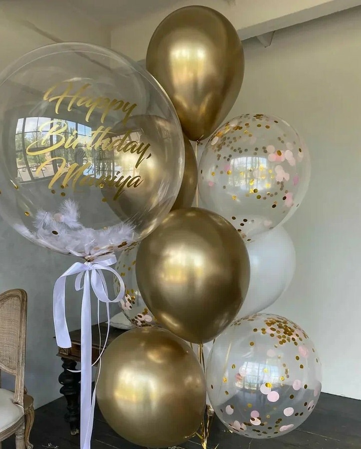 Шар баблс с белыми перьями и Вашей надписью на грузике