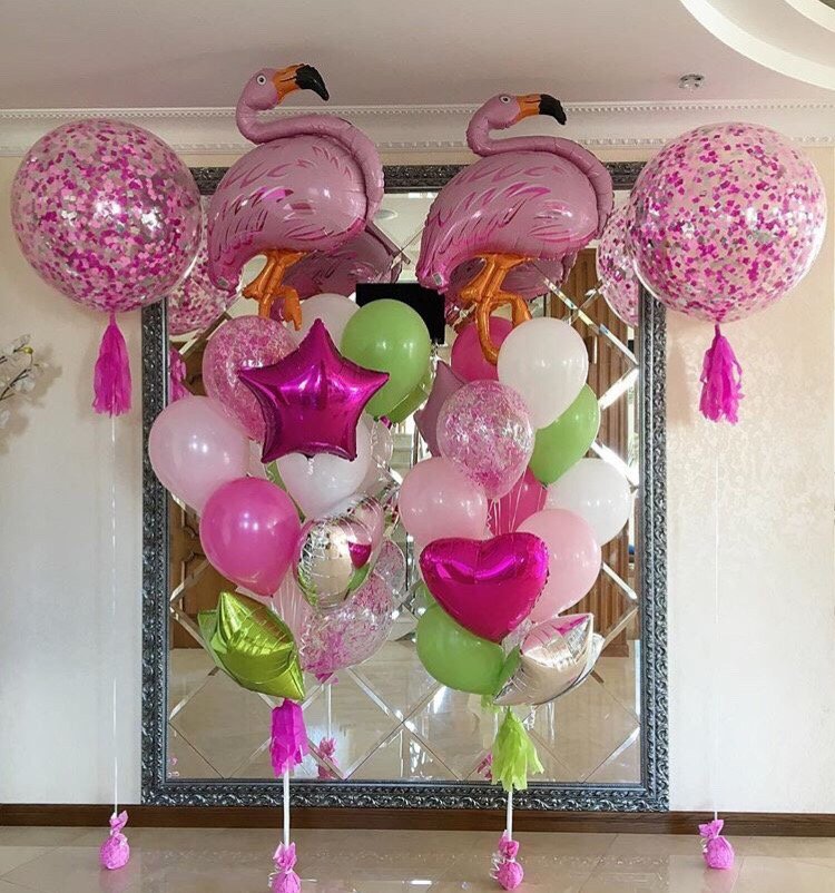 Композиция из 2 букетов, круглых шаров и фламинго из фольги