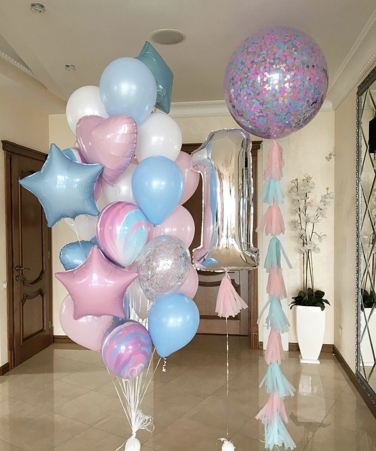 1) Большой шар 75см с конфетти розовый и голубой на тассел (розовый, голубой)
