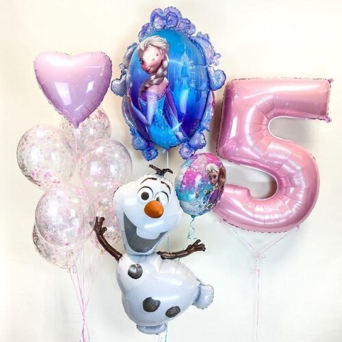 Композиция из шаров с цифрой “Холодное Сердце” и снеговиком Олафом