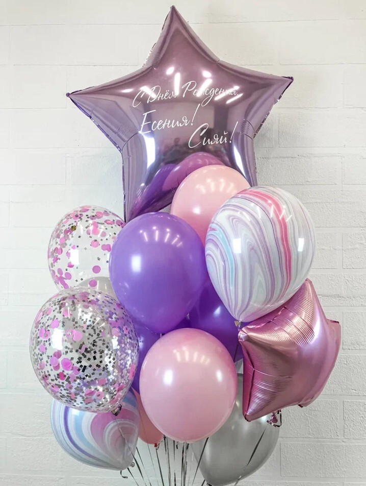 Композиция из шаров “Супер-звезда” в сиреневом цвете с вашей надписью