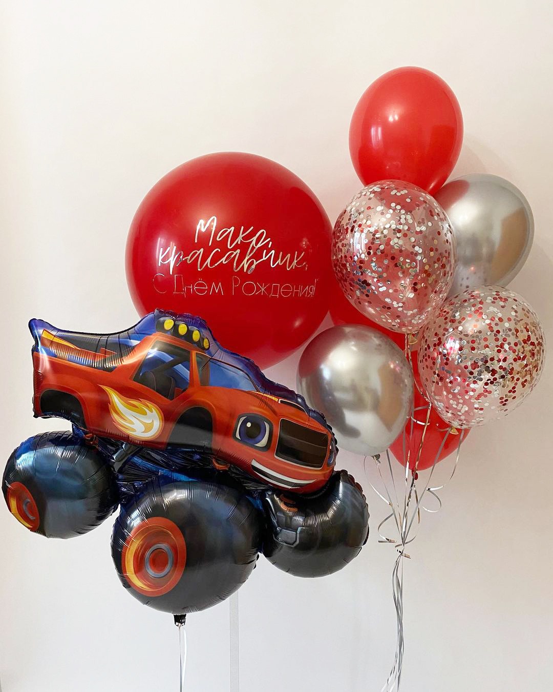Композиция из шаров в красном и серебряном цвете с фигурой “Вспыш”