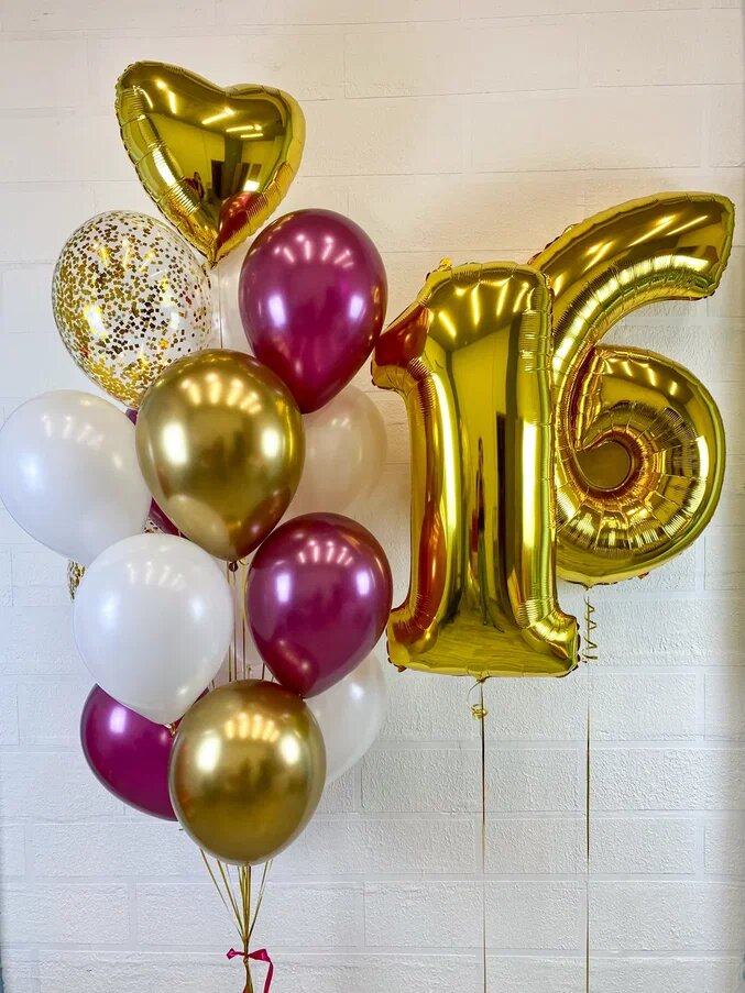 Композиция на 16 лет в золотом и белом цвете с шарами бургундия