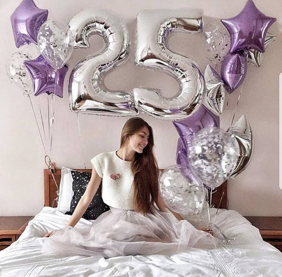 Композиция на день рождения девушке с фольгированными звёздами, цифрами и шарами с конфетти