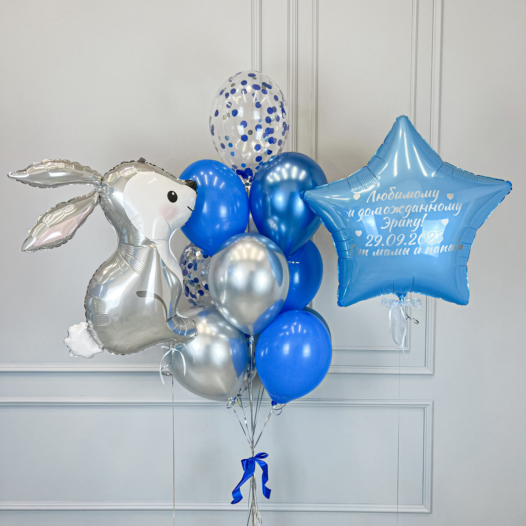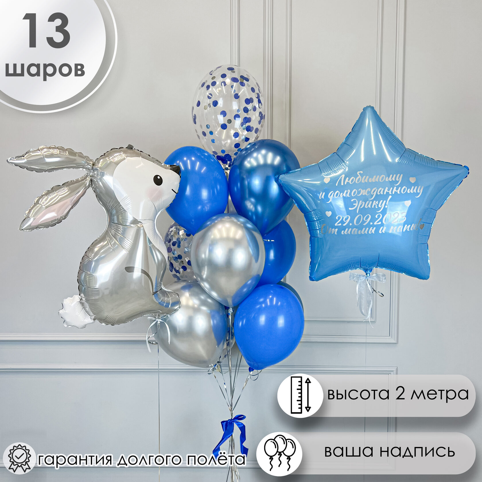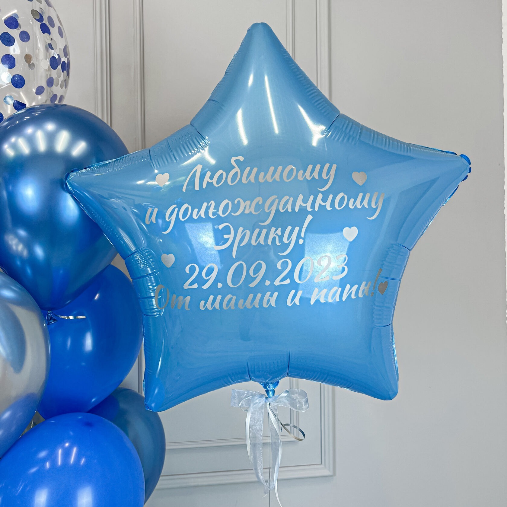 – Фольгированная звезда голубая 80см с индивидуальной надписью