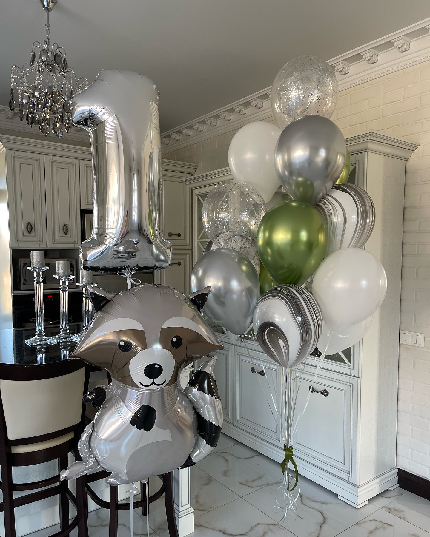 Композиция в серебренных цветах на 1 годик с фольгированным енотиком