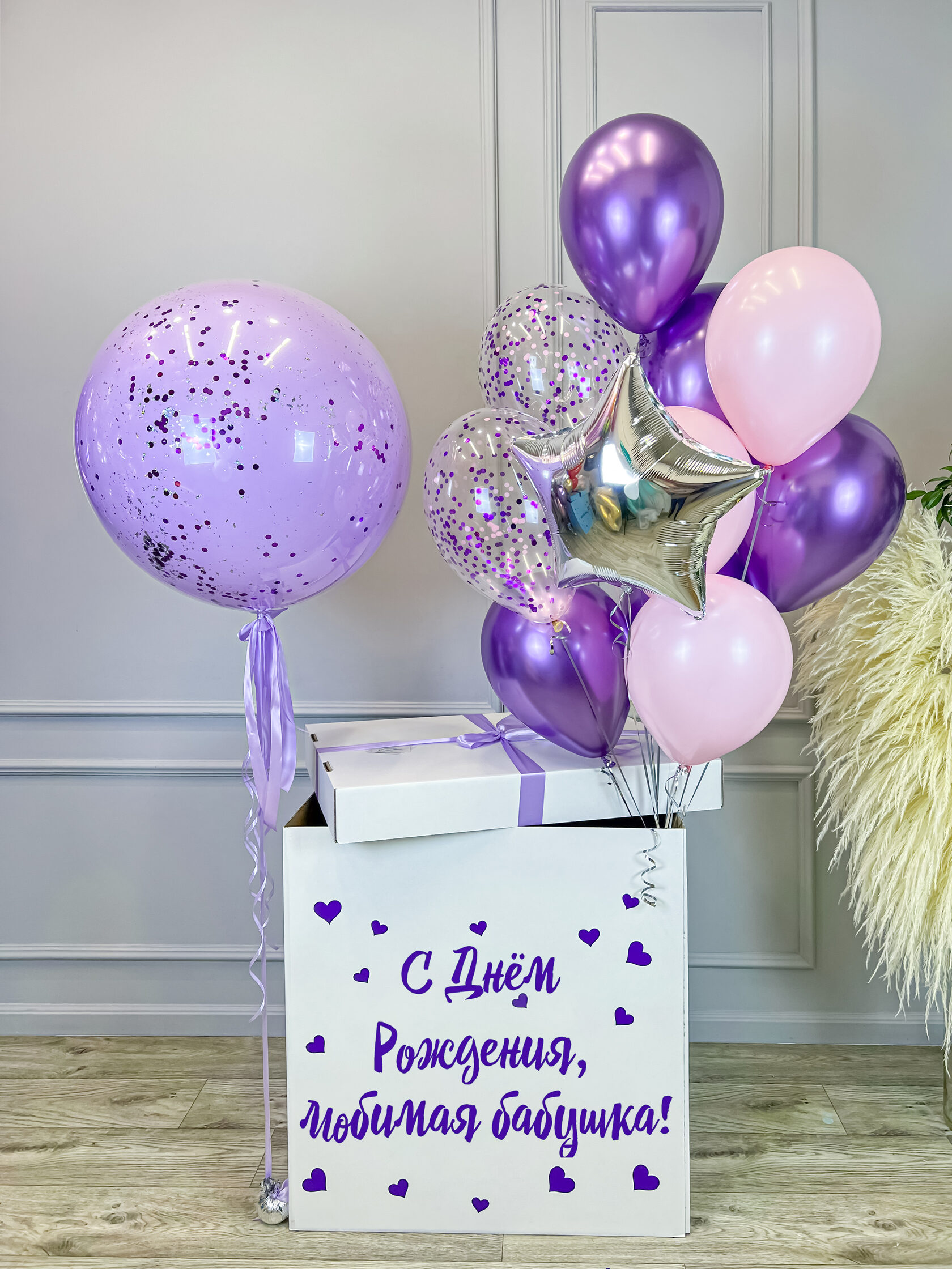 Коробка с гелиевыми шарами и с большим сиреневым шаром