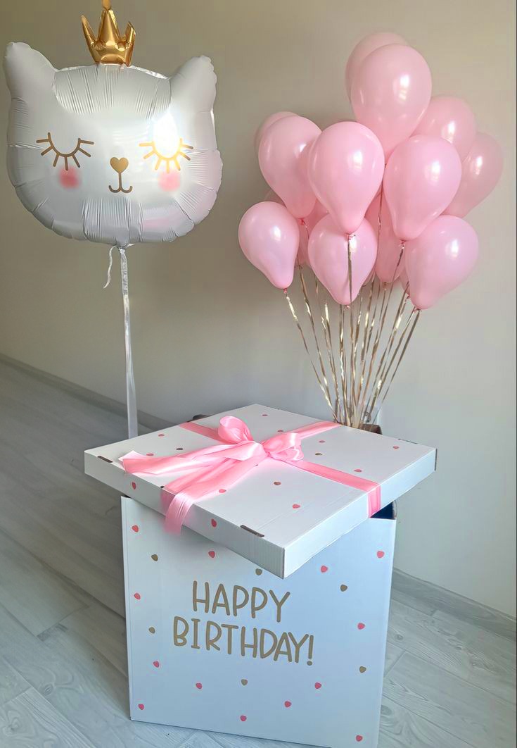 Коробка-сюрприз для девочки с фигурой “Котенок-принцесса” и розовыми шарами