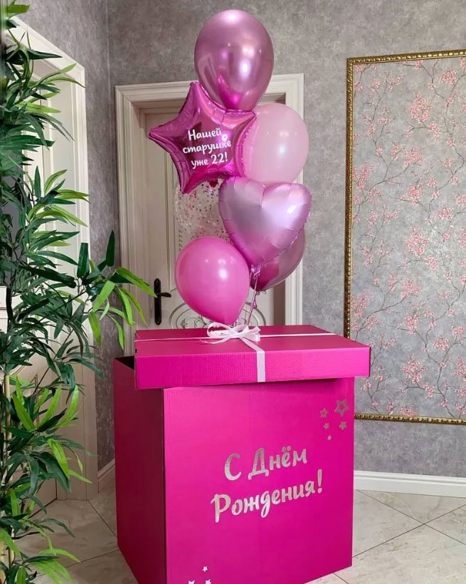 Коробка-сюрприз фуксия с шарами в розовых оттенках
