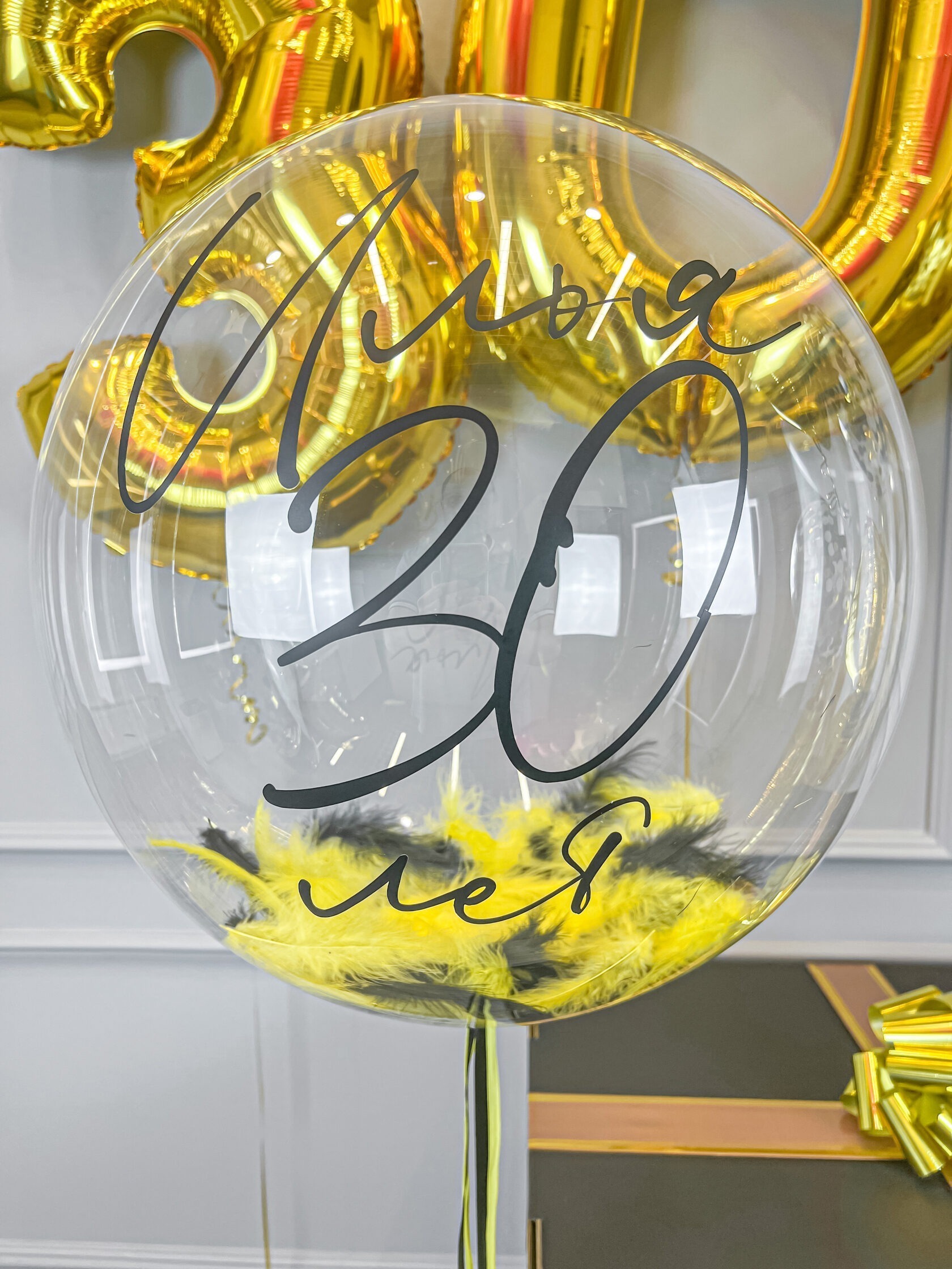 Шар баблс + жёлтые/чёрные перья + ваша надпись.