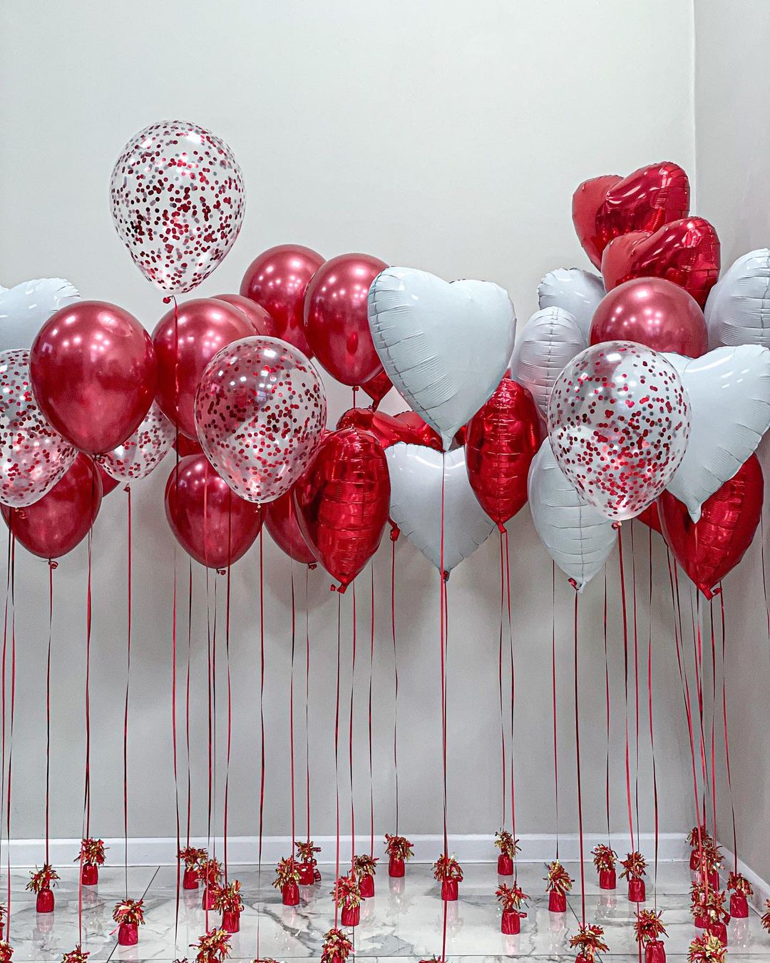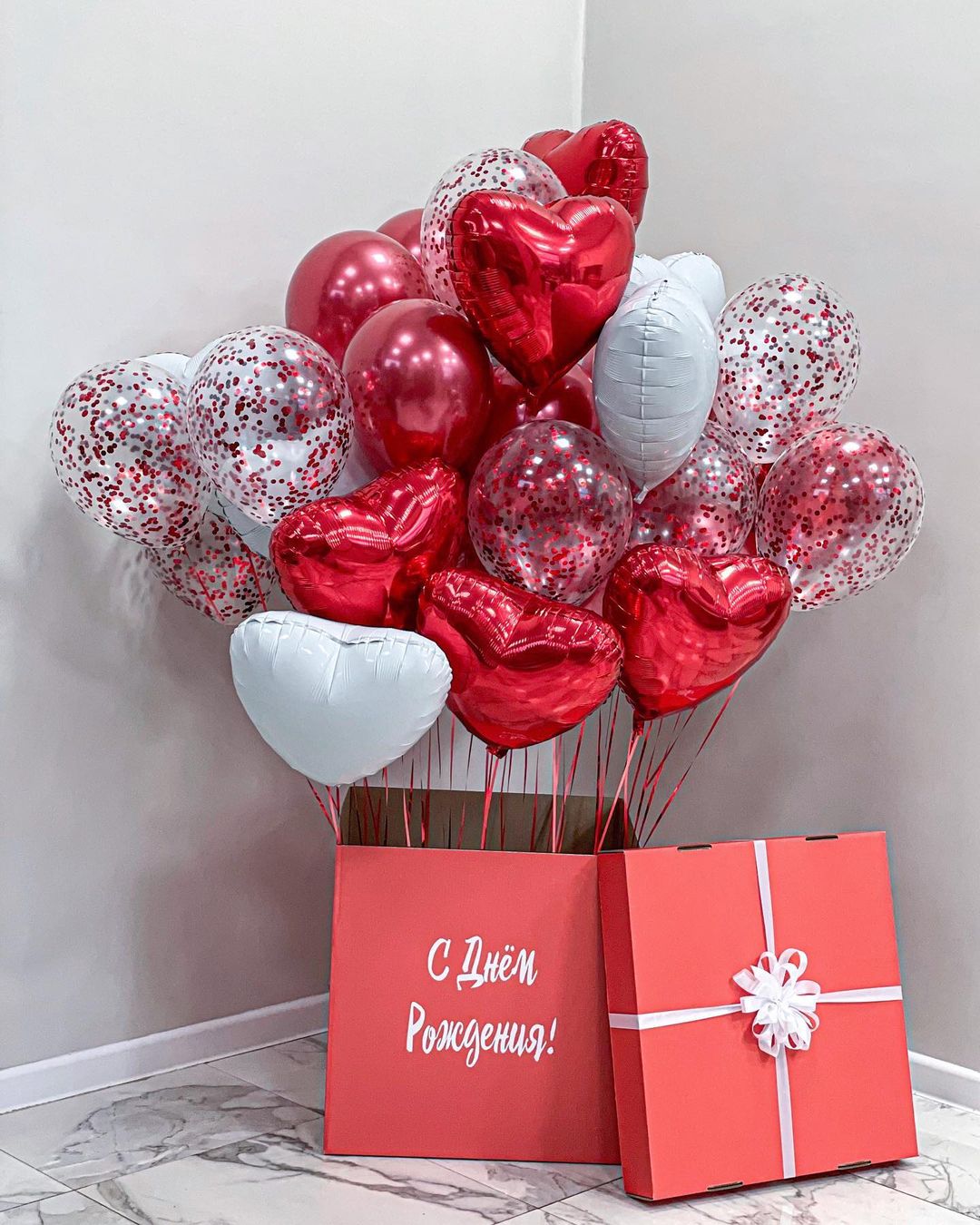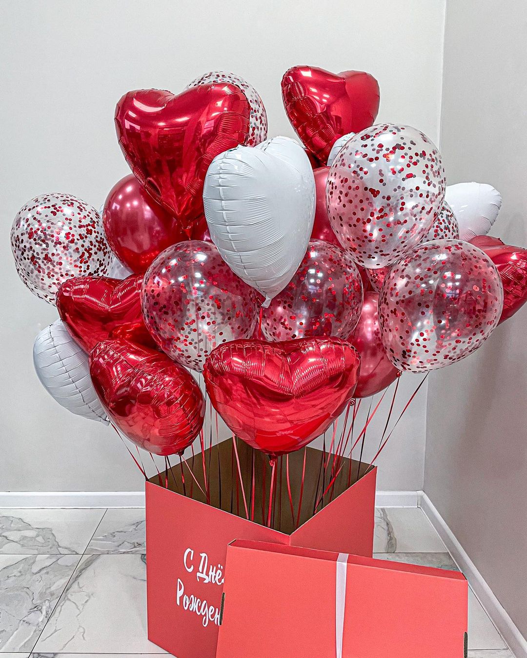 Красные и белые сердца с коробкой-сюрприз в красном цвете