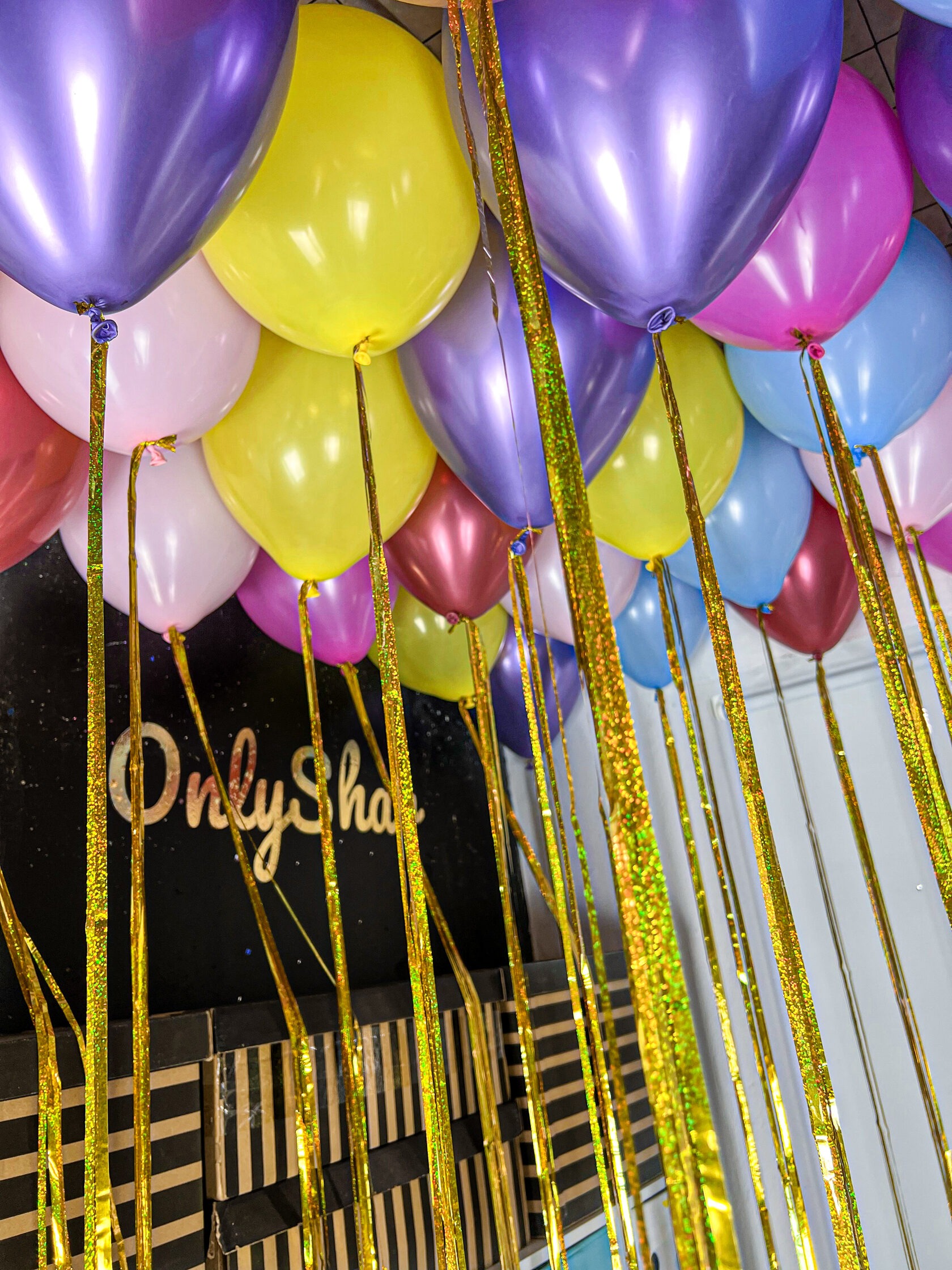Разноцветные шары под потолок с надписью “С Днем Рождения”