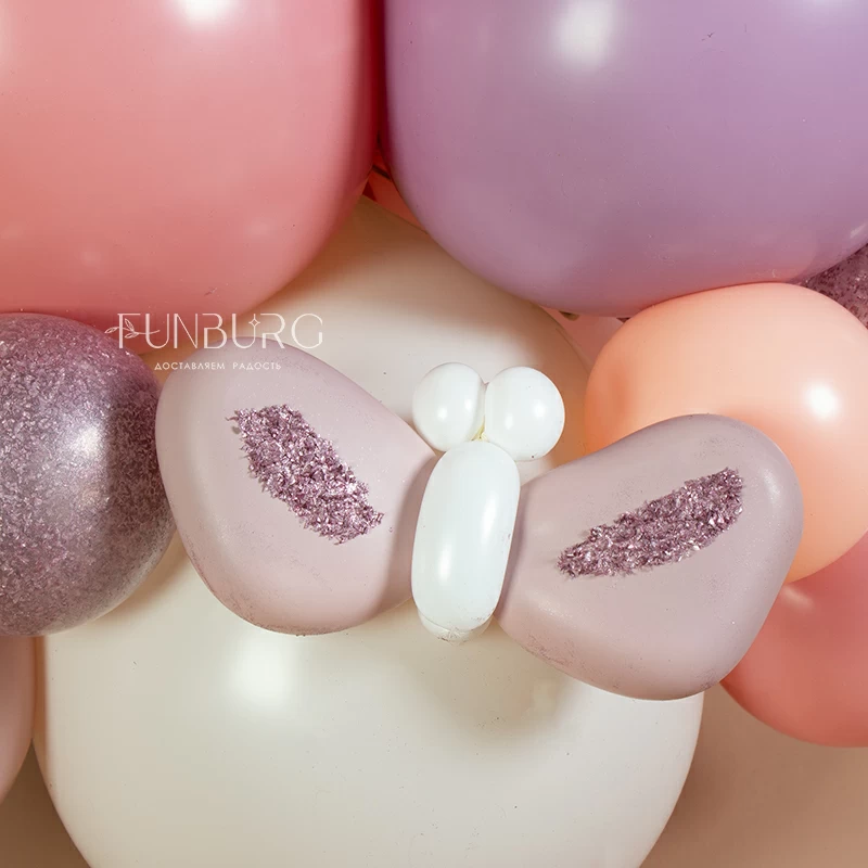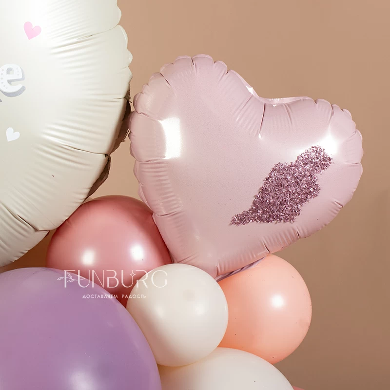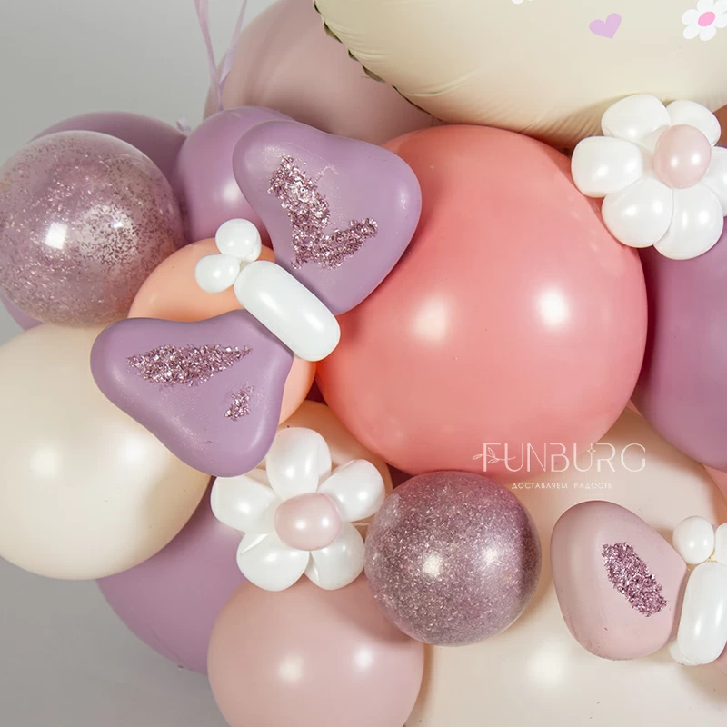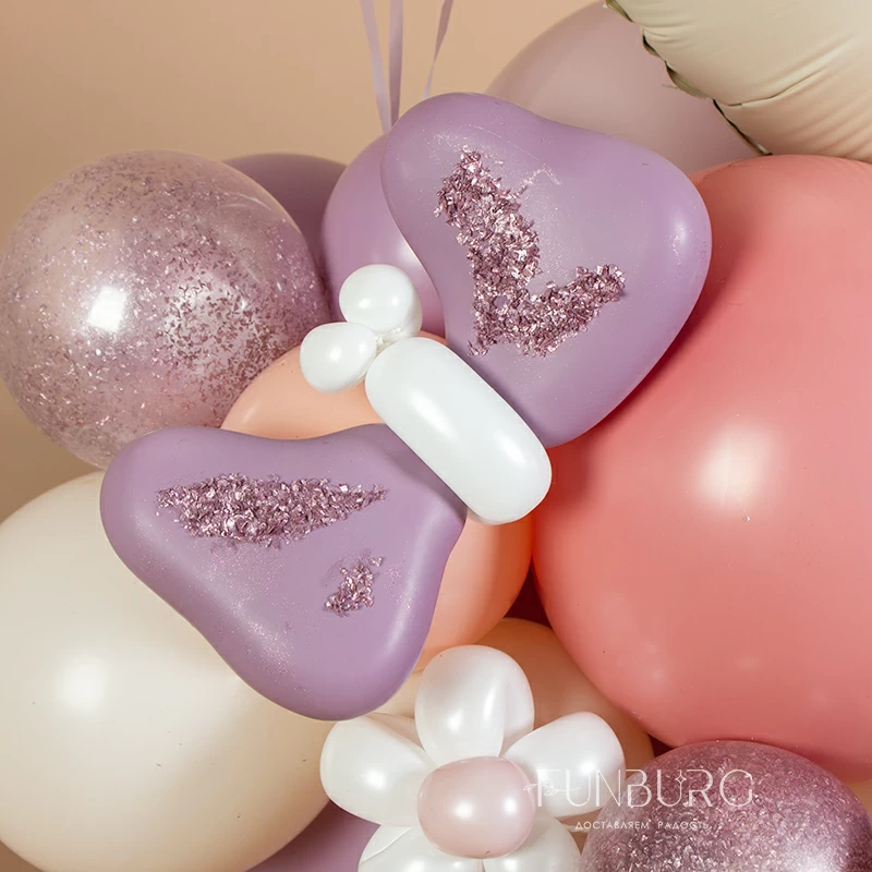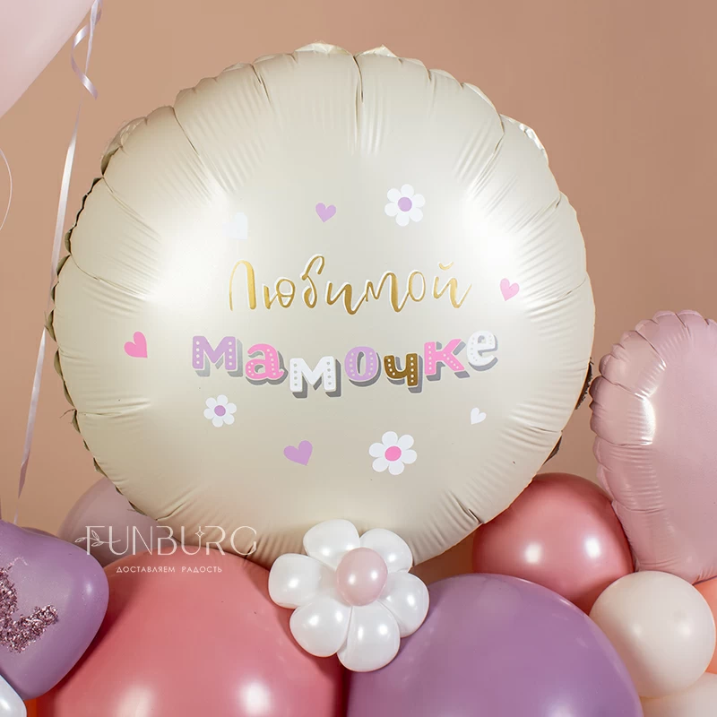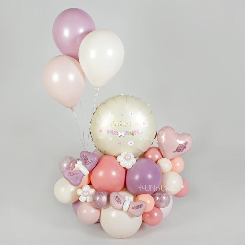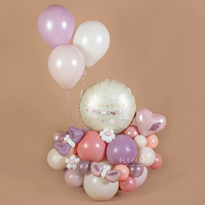 Миниатюрная фигура из шаров для любимой мамы (а если изменить надпись, то и для другого получателя) с сатиновым кругом с надписью в мягкой гармоничной цветовой гамме, украшенная цветочками, мягко сияющими конфетти, сердечком, маленькими шариками с гелием и миниатюрными бабочками. Фигура достаточно небольшая, поэтому ее удобно ставить на стол иди другую поверхность.
