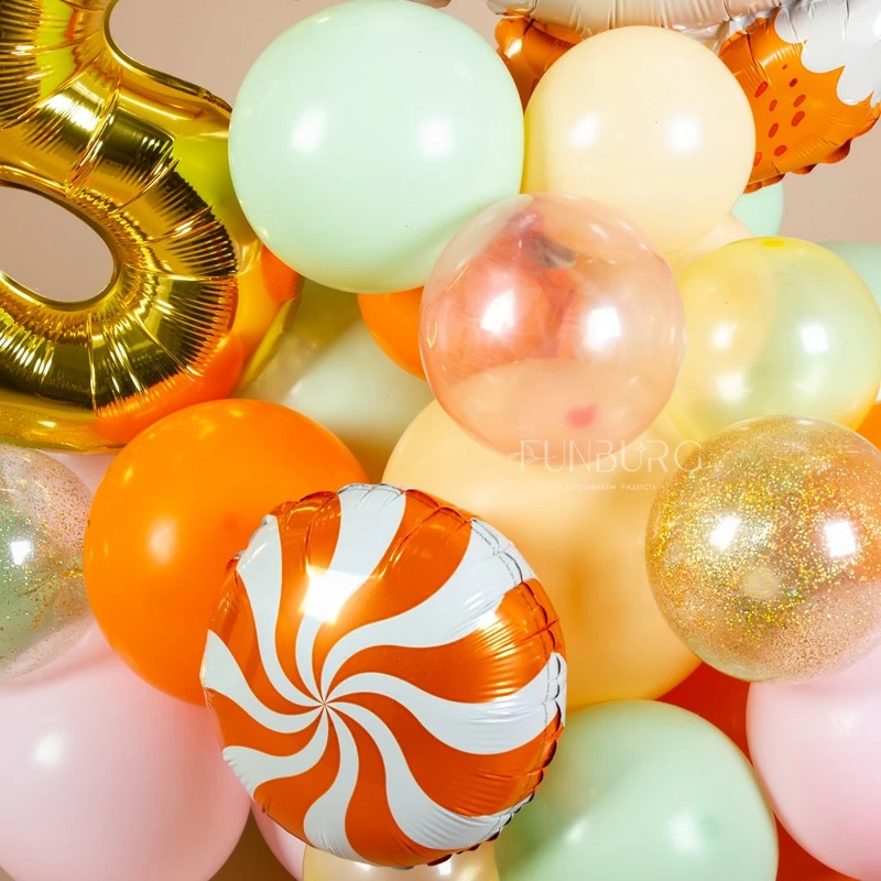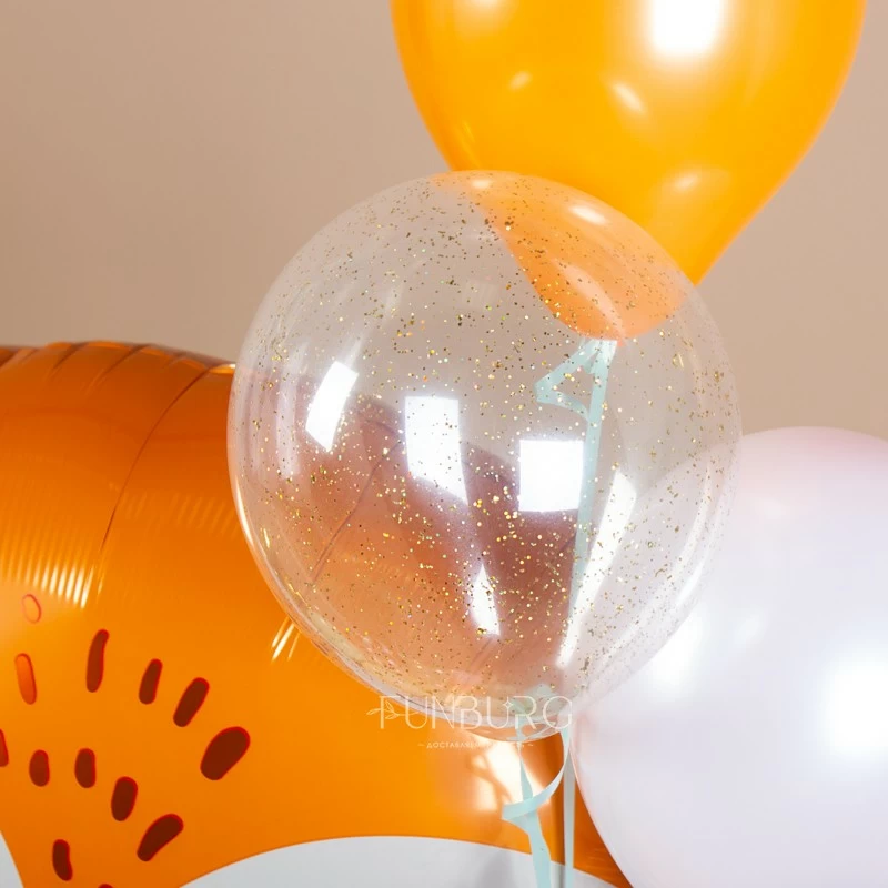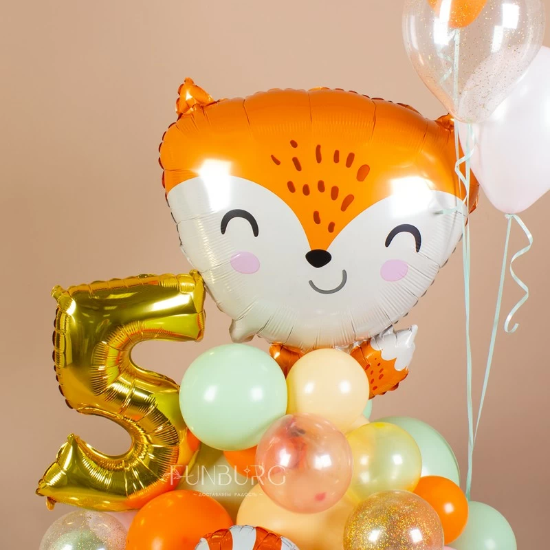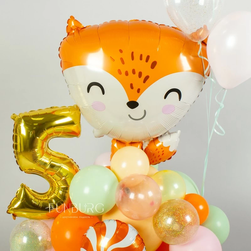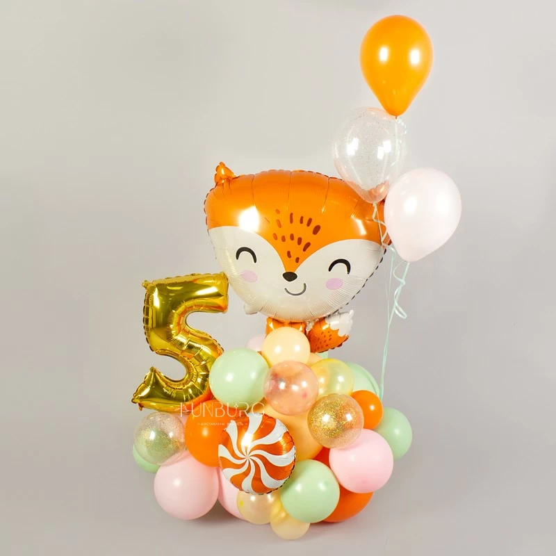 Небольшая фигура из шаров на день рождения с очаровательным лисенком на разнокалиберном основании в солнечных и нежных оттенках. Фигурка дополнена маленькой цифрой (ее можно сделать любой) и маленькими шариками с гелием.