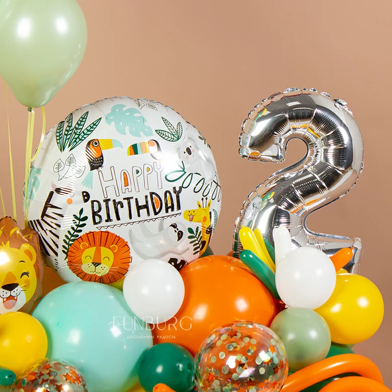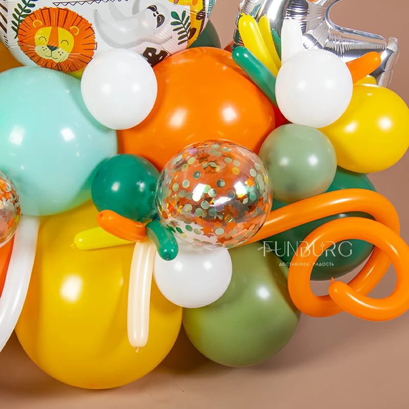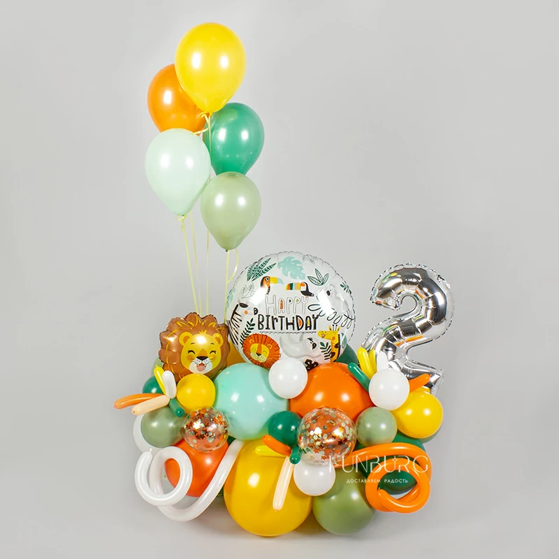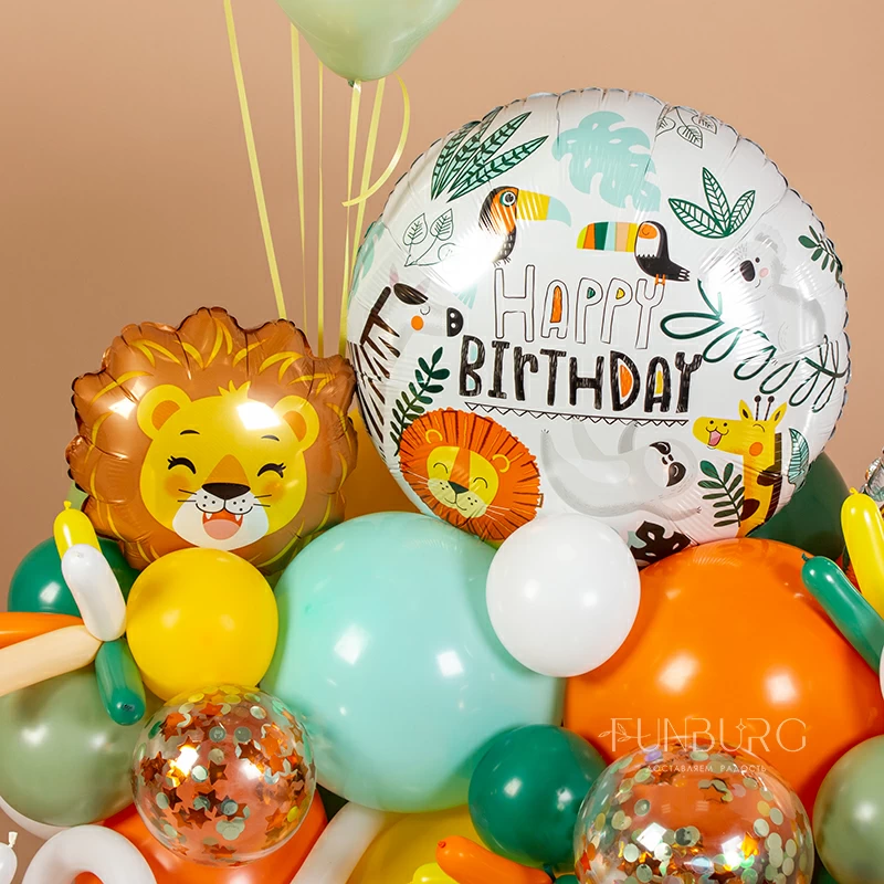 Мини-фигура из шаров на день рождения с тематическим кругом с рисунками забавных животных, с шариком в виде львенка, цифрой и шариками с конфетти. Для веселых первых дней рождения подойдет идеально!