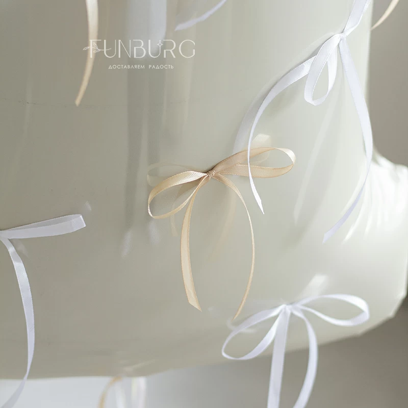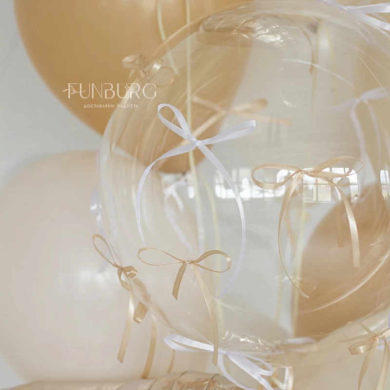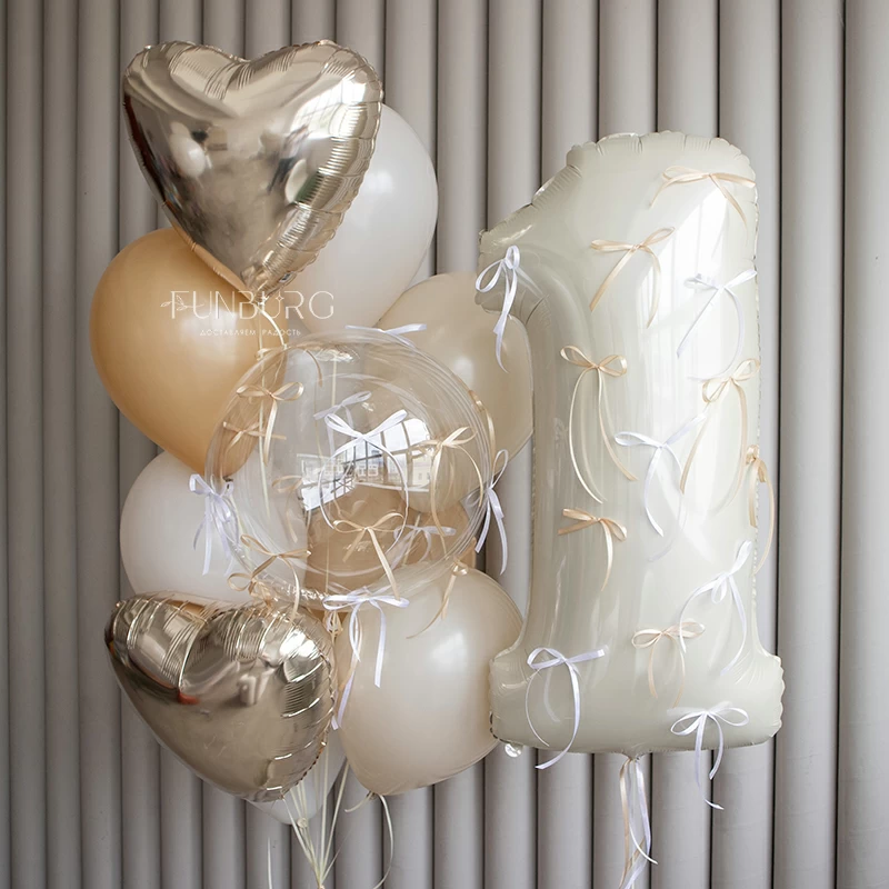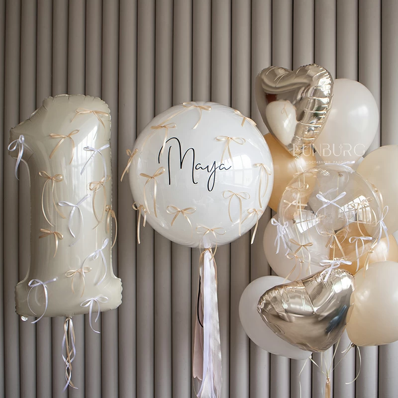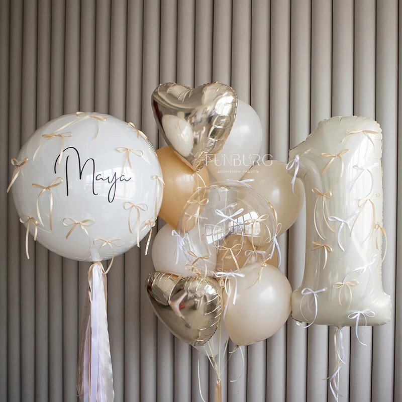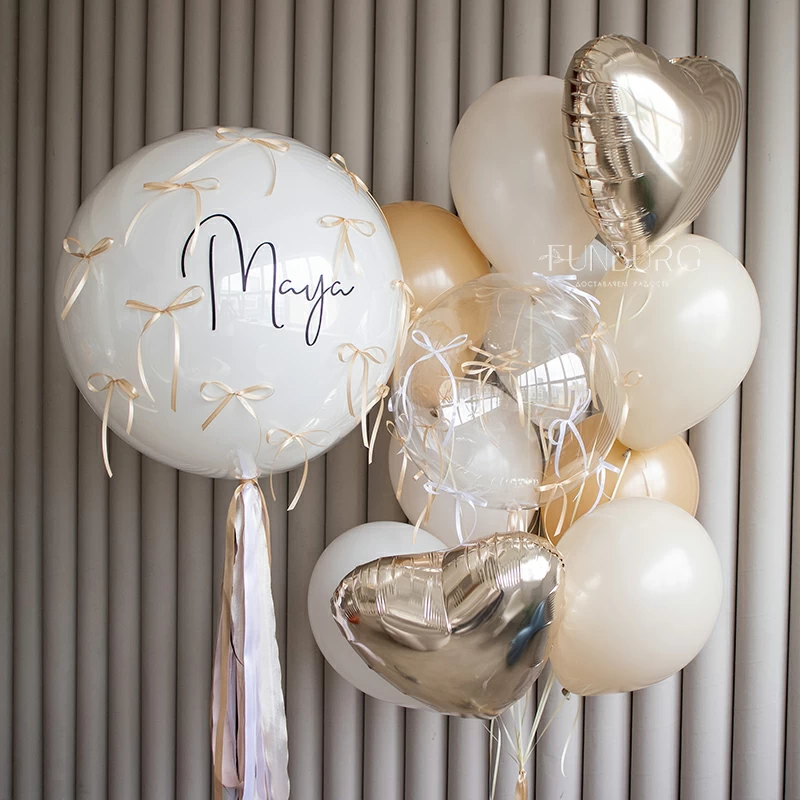 Большой зеркально-глянцевый белый шар, усыпанный трогательными бантиками, с надписью (ее можно сделать любой) создан для самых нежных моментов и получателей! Шар мы дополнили идеально подходящей к нему связкой шариков с блестящими сердцами и прозрачным шаров Bubble с бантиками, а еще в наборе есть цифра (ее можно сделать любой), которую мы украсили под стать остальным шарикам.