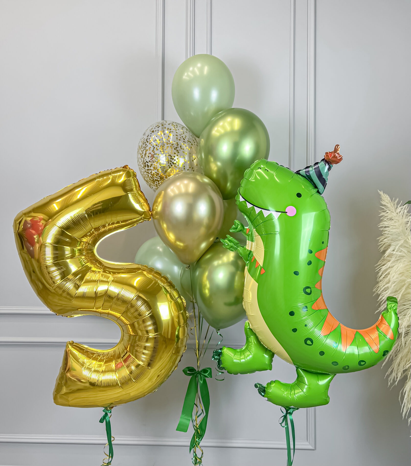 Набор гелиевых шаров с динозавром в зеленом и золотом цвете