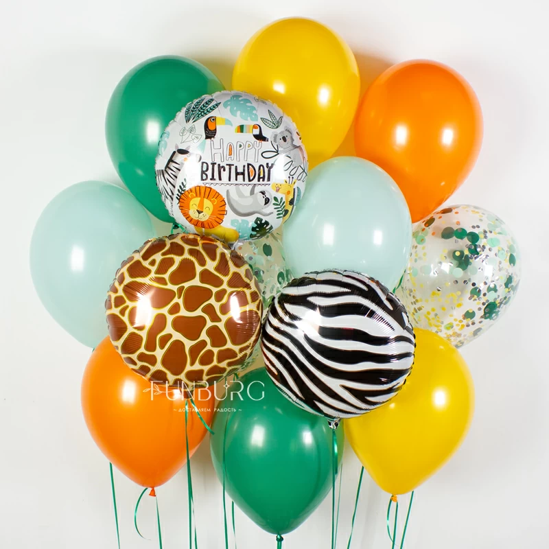 Яркий набор из шариков сочной тропической гаммы с шариком с рисунками очаровательных животных и кругом с принтом зебры, идеален для подарка на День рождения любителю дикой природы и для украшения тематического праздника!