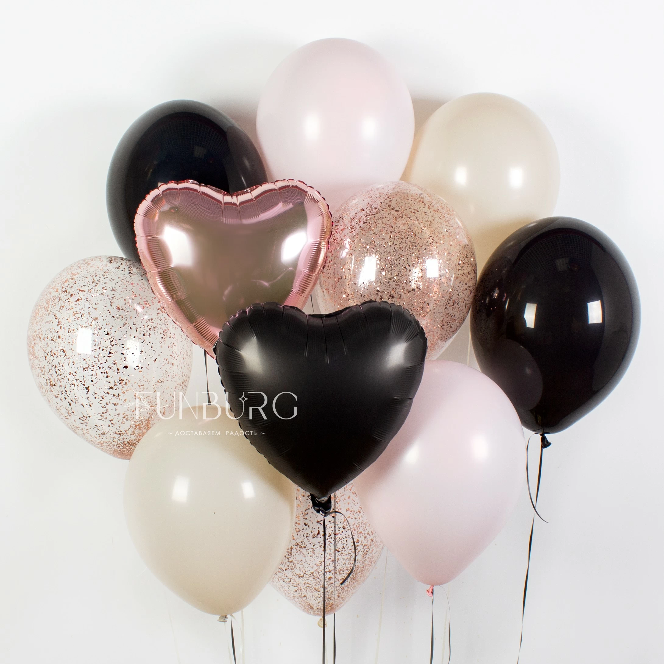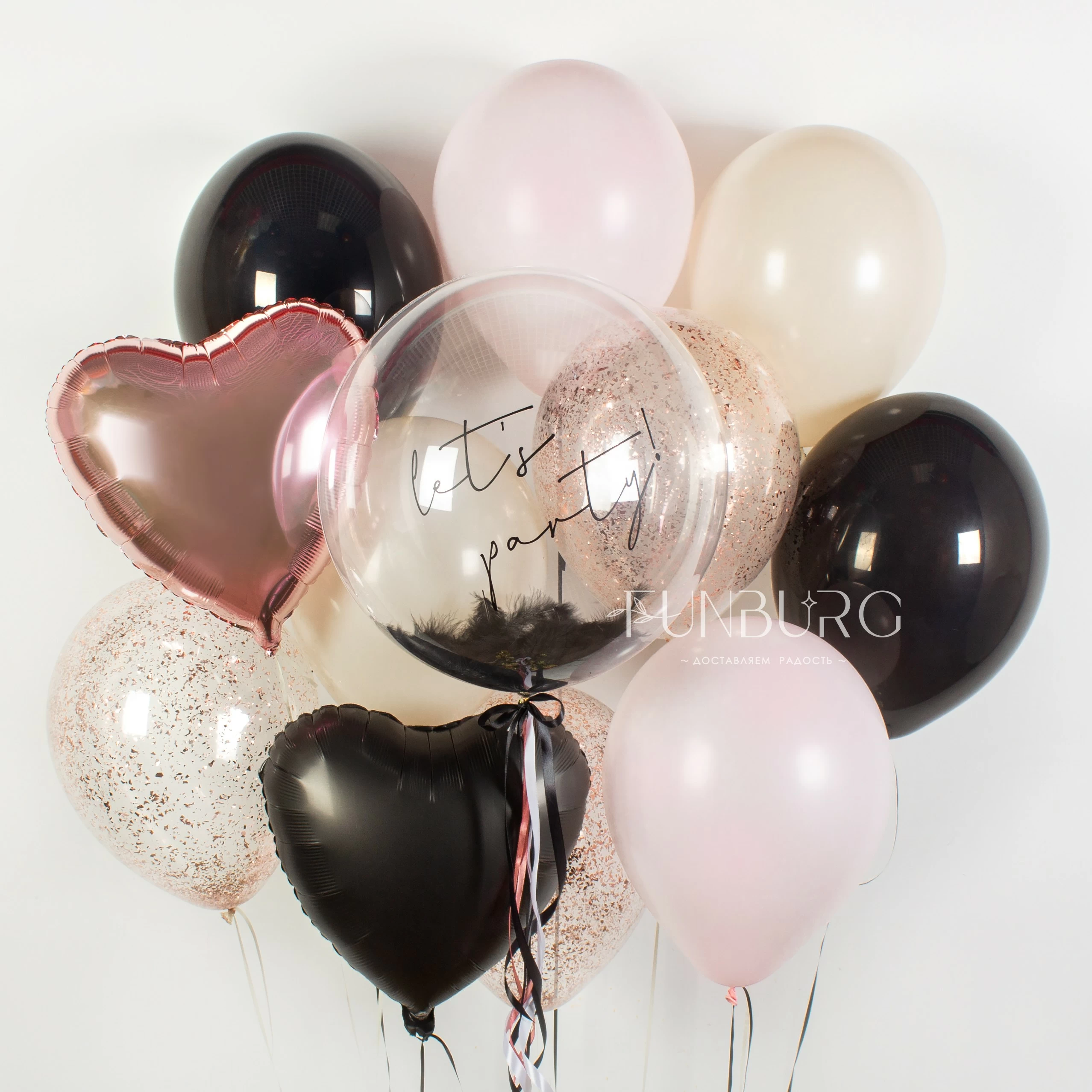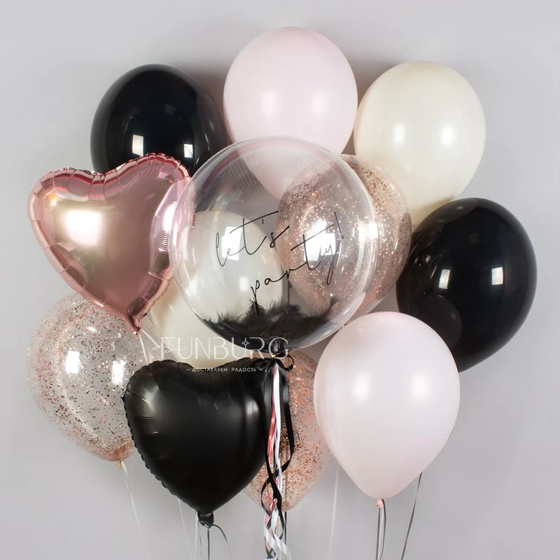 Глянцевый черный, кремовый, сливочно-розовый, искорки конфетти оттенка “розовое золото”, идеально прозрачный шар Bubble* с перьями, шлейфом из ленточек и надписью, сердечки – набор, идеальный для вечеринки и девичника!