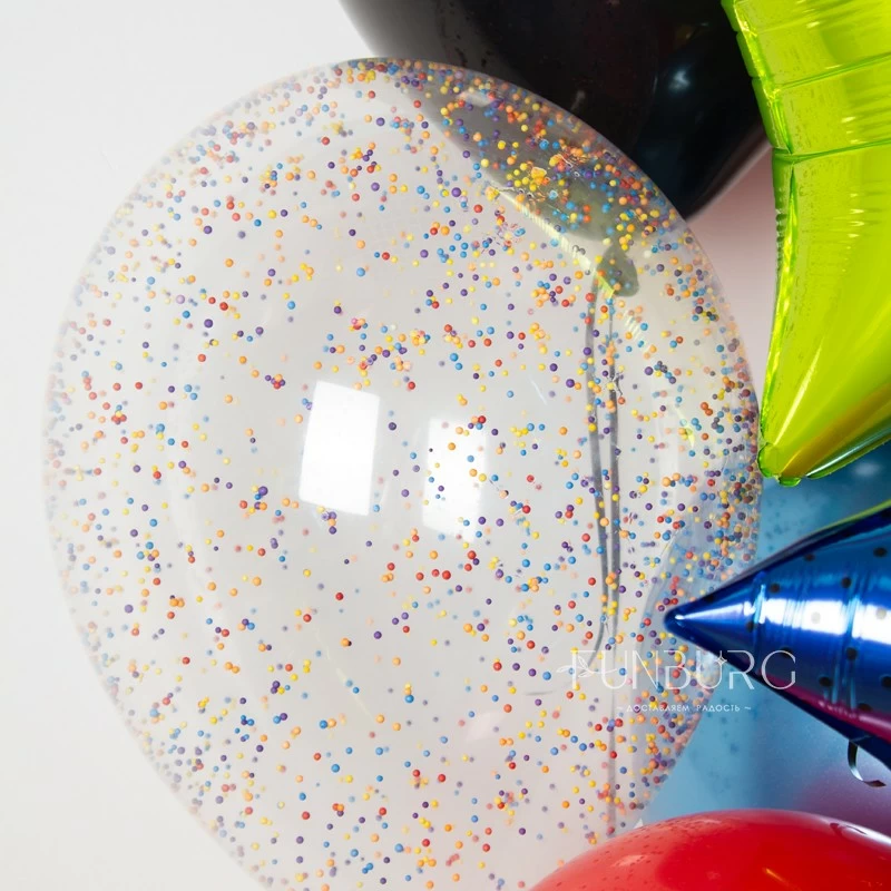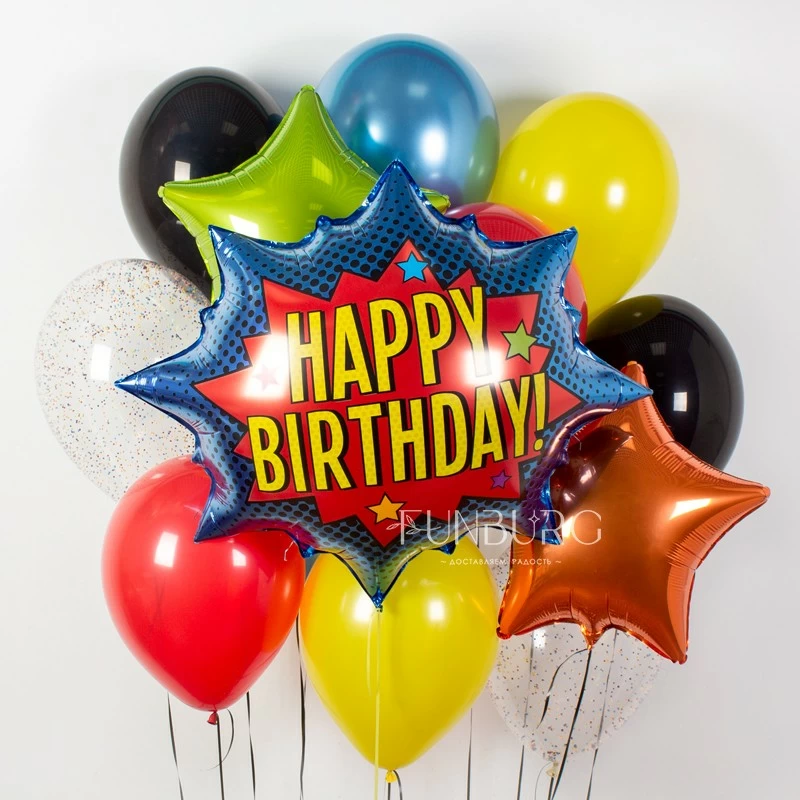 Boom! Шарик-взрыв, словно сошедший со страниц комиксов или работ поп-арт художников, мы дополнили миксом желтых, красных, мерцающих синих и глянцевых черных шариков, добавили шарики с конфетти (в которых будто взорвался автомат с леденцами) и звездочки, повторяющие звезды на главном шарике. Такое яркое поздравление именинник точно запомнит надолго!