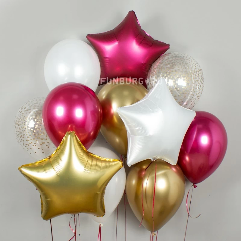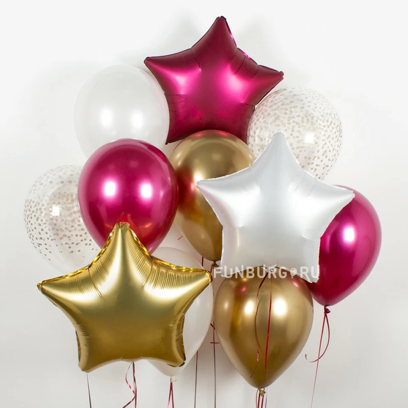 Оттенок спелого граната, контрастный сияющий сатиновый белый и шарики с рисунком в виде золотого конфетти – сложное, но гармоничное сочетание, как многогранный купаж хорошего французского вина, искрящегося на языке множеством вкусовых оттенков. Для самых важных и торжественных праздников