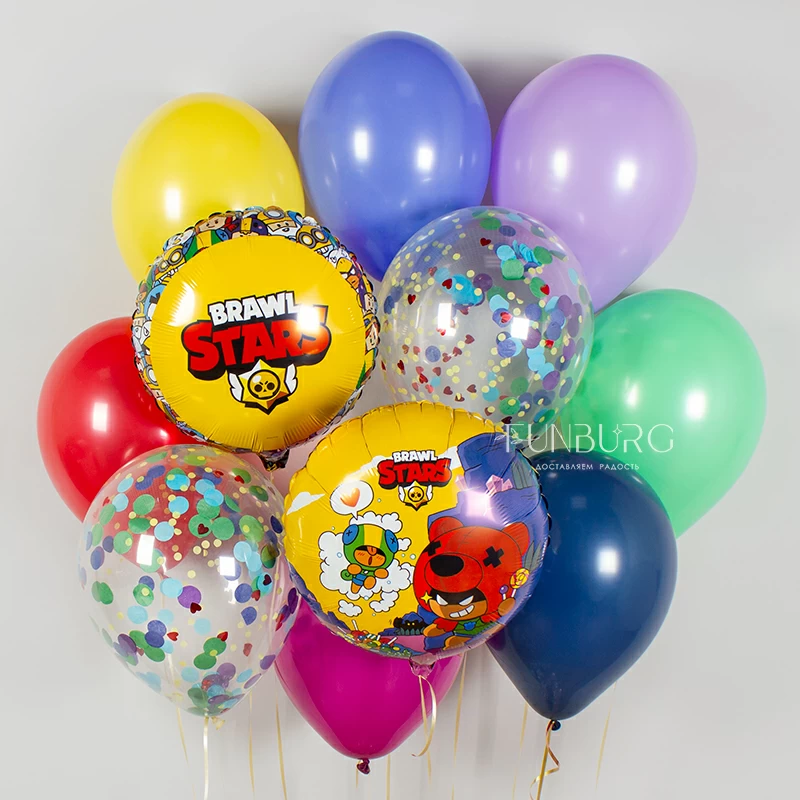 Идеальный набор в подарок любителю игры Brawl Stars или для украшения тематической вечеринки! В Нем целых два тематических шара и разноцветные шарики без рисунка и с конфетти, повторяющие оттенками цвета на шариках.