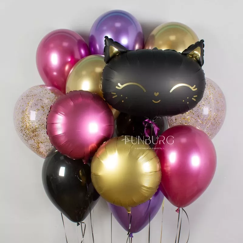 Более смелая и яркая версия набора шариков с котенком! Черный сатиновый котёнок с золотыми элементами в окружении насыщенных фиолетовых, ярко-розовых и золотых сияющих шаров Chrome, сатиновых кругов, полупрозрачных сиреневых шариков с золотистым конфетти и парочки черных шариков. Когда любовь к котикам не всегда равна любви ко всему нежному и пастельному 😉