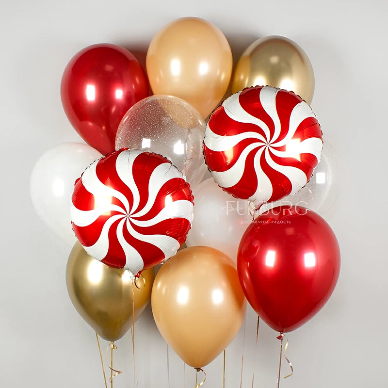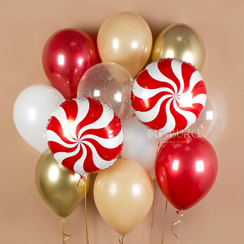 Не самое стандартное новогоднее сочетание, но очень красивое и гармоничное! Оттенок ириски, конфетти-снег, похожий на сахарную пудру, красно-белые карамельки, напоминают о сладостях, которых так много везде в новогодние праздники 😉