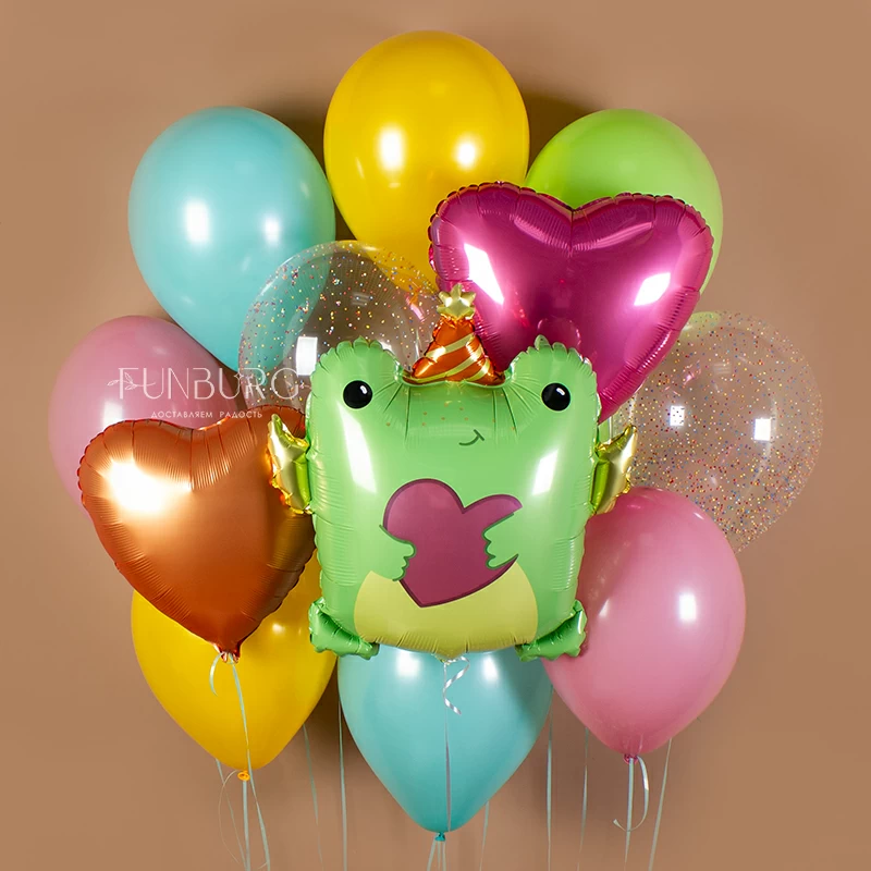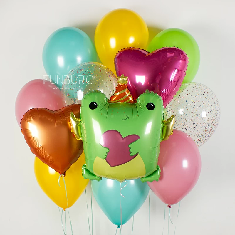Очаровательная лягушечка с сердечком в руках и в забавном праздничном колпачке, в окружении ярких шариков, сердечек и конфетти, похожих на конфетки, украсит любой праздник и вызовет улыбку и у детей, и у взрослых! Идеально для любителей этих прыгучих созданий.