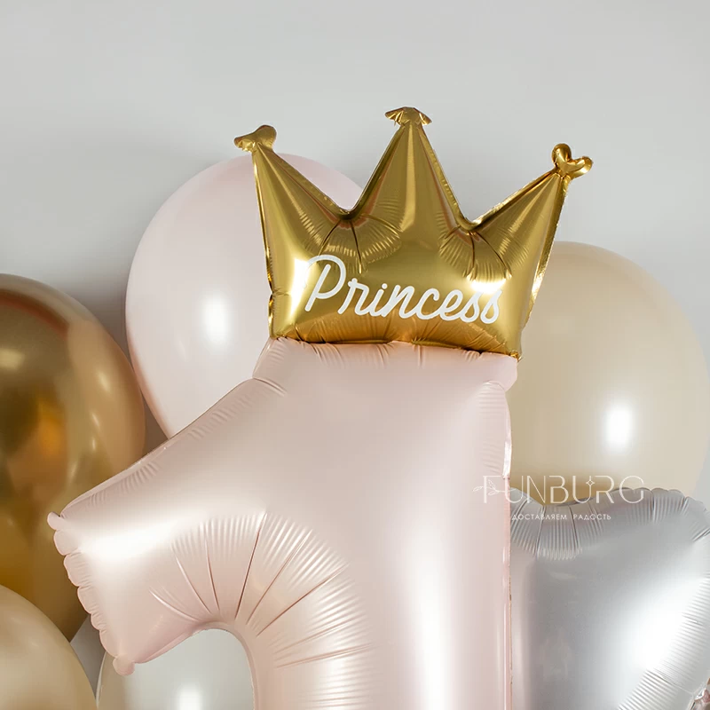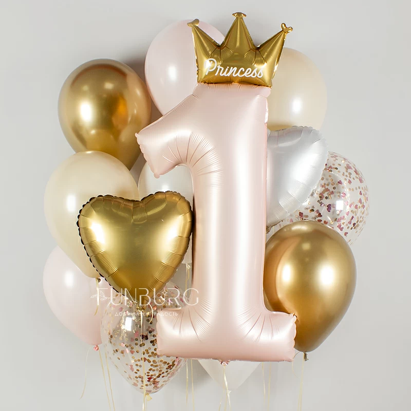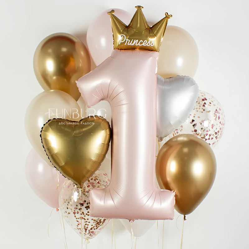 Нежнейший набор в кремово-белых, сливочно-розовых и золотых оттенках с красивой сатиновой цифрой 1, украшенной золотой короной, создан украсить первый день рождения маленькой принцессы!
