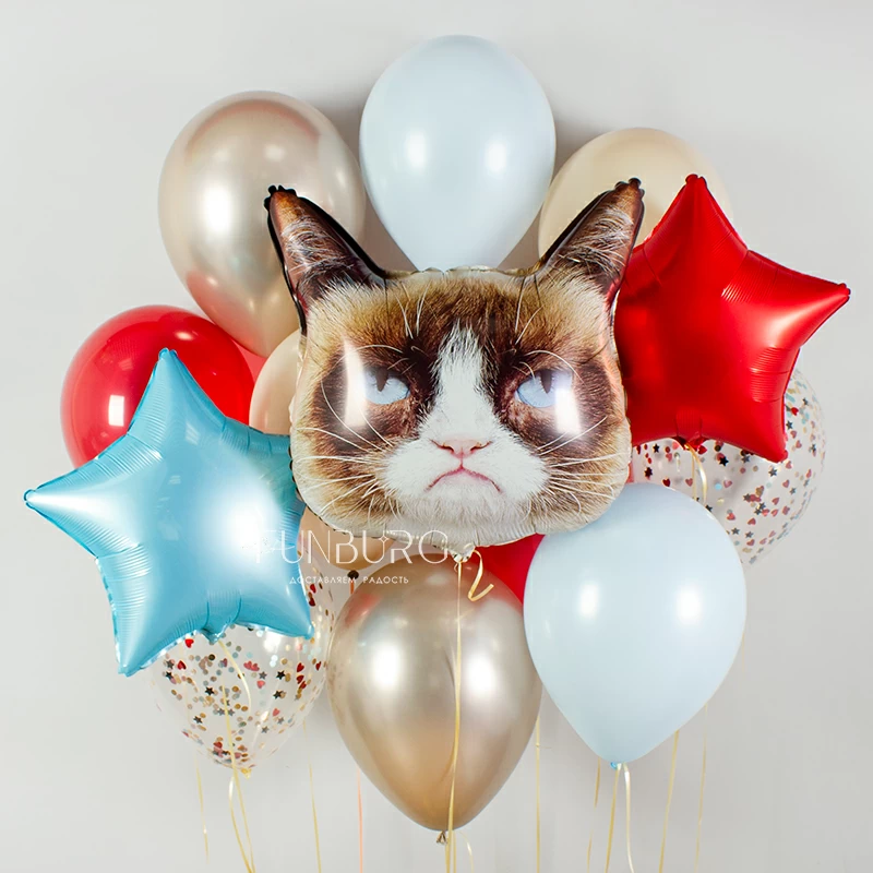 Шар в виде мордочки героини множества мемов и как будто бы вечно недовольной пушистой интернет-знаменитости Grumpy Cat (Сердитой кошки, или, как ее звали на самом деле, Соус Тардар), дополненный шариками под цвет ее шерстки и голубых глаз, а также яркими красными шариками идеально подойдет для шутливого поздравления вечно недовольных именинников или еще для множества других случаев, которые вы точно сможете придумать!