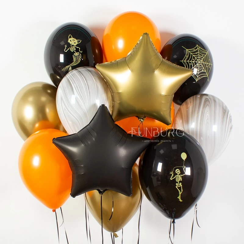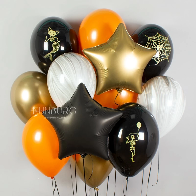 Классическое, но в нашем фирменном прочтении, сочетание черного и оранжевого, дополненное сатиновым золотом и мистическими мраморными переливами агатов. На черных шариках можно отыскать золотые контуры скелетов, но не совсем обычных: вы встречали картинки скелета, прогуливающегося с воздушным шариком, или скелетов кошки-русалки, единорога, летучей мыши? Пугающе прекрасно.