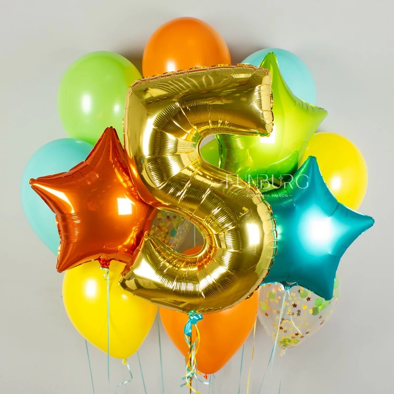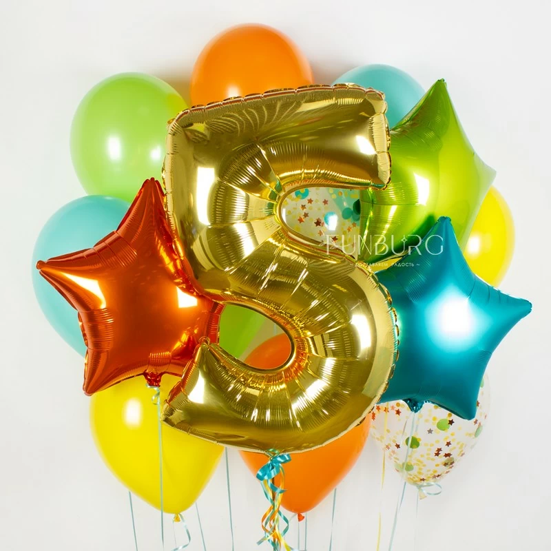 Дополнили набор цифрой, но не стандартного размера (около метра в высоту), а поменьше (примерно 80 см): такие цифры более компактные и гармоничнее смотрятся в наборе, не закрывая собой остальные шарики.
