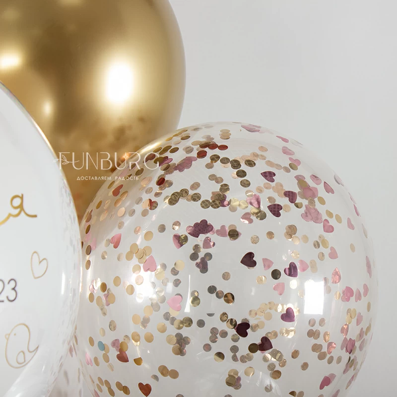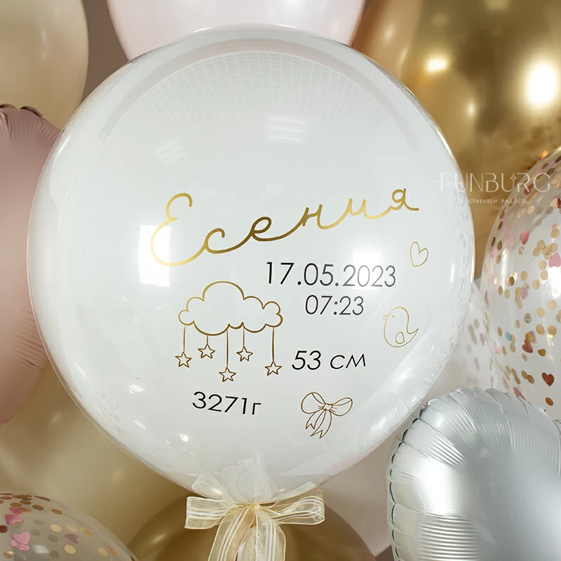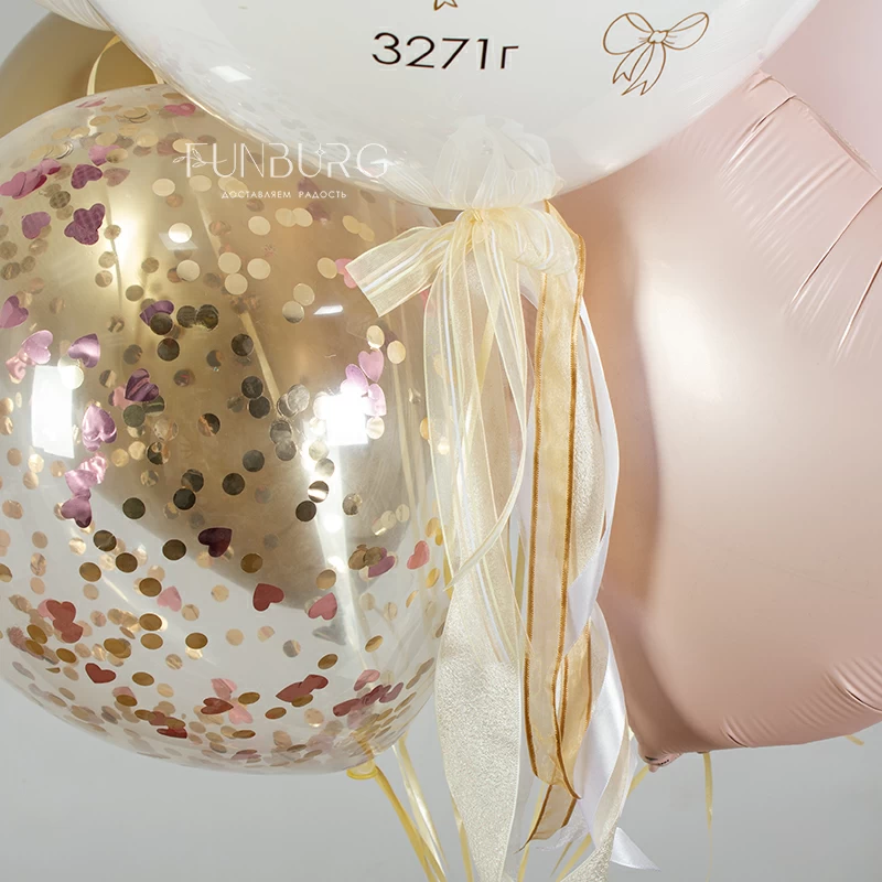 Нежнейший набор в кремово-белых, сливочно-розовых и золотых оттенках с большим шариком с метрикой идеально подойдет на выписку и первые дни рождения, а если изменить надпись, то и для множество других событий!