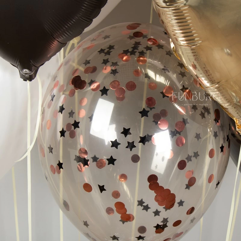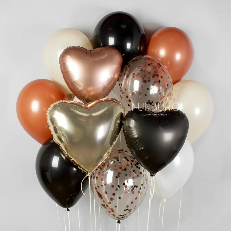 Согревающий, как горячий кофе с пряностями микс тёплых природных оттенков с добавлением белого и черного. Матовая фактура шариков гармонично сочетается с блеском глянцевого шара Bubble, круглых и звездочек конфетти в серых кристальном шариках и мягким мерцанием сатиновых сердец. Шар Bubble с тонкой изящной надписью как будто облегчает набор и дарит ему воздушность.