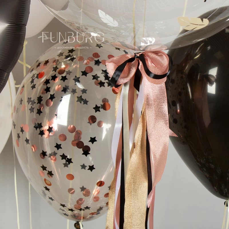 На кристально-прозрачном шаре Bubble с шлейфом из разнофактурных лент надпись может быть любой (укажите нужную надпись в комментарии к заказу или скажите менеджеру при подтверждении заказа).