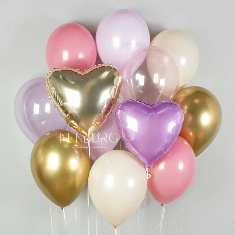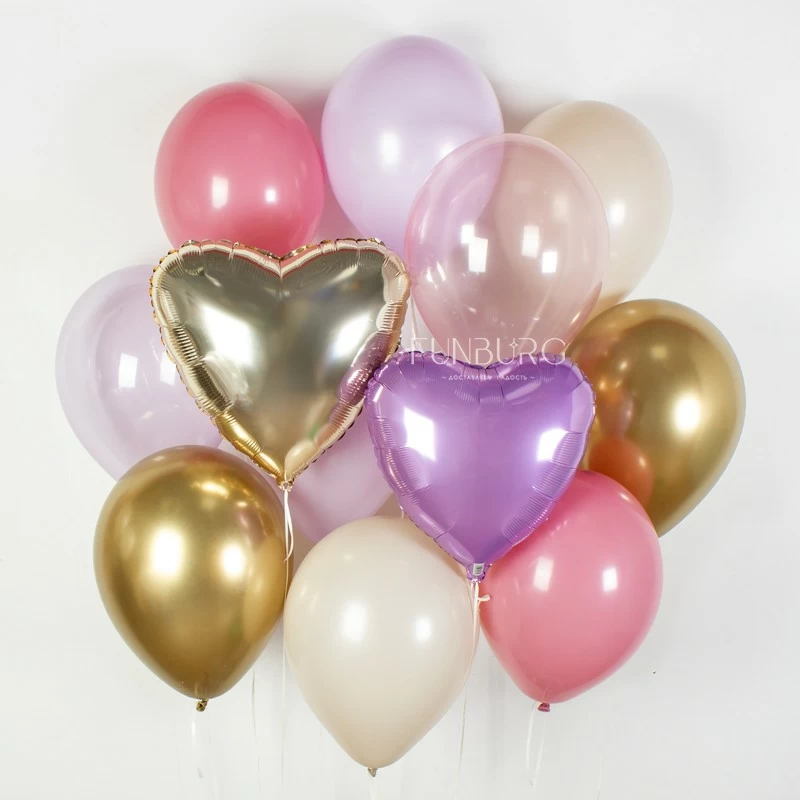 Нежные акварельные и пастельные оттенки сиреневого, ягодного и розового, дополненные мягким песочным и мерцающим золотом. Матовые шарики разбавлены полупрозрачными розовыми и сиреневыми кристаллами и сердечками. Мы не стали добавлять шарики с конфетти, чтобы выдержать лаконичность и плавность цветовых переходов, но по вашему желанию сможем подобрать и добавить подходящие шарики с конфетти, чтобы сделать набор торжественнее и праздничнее.