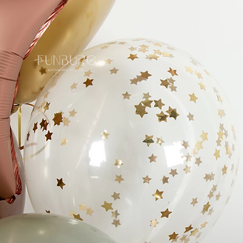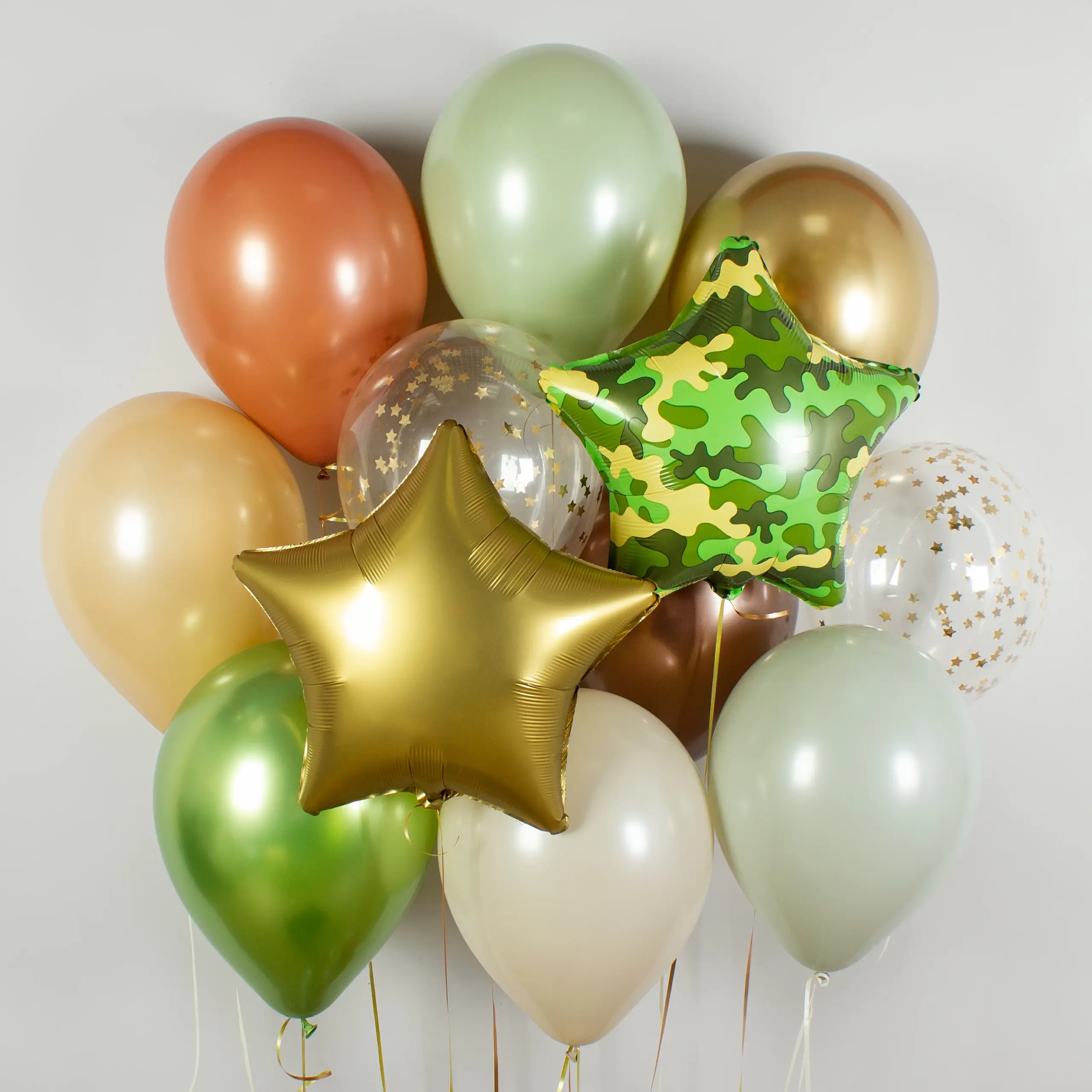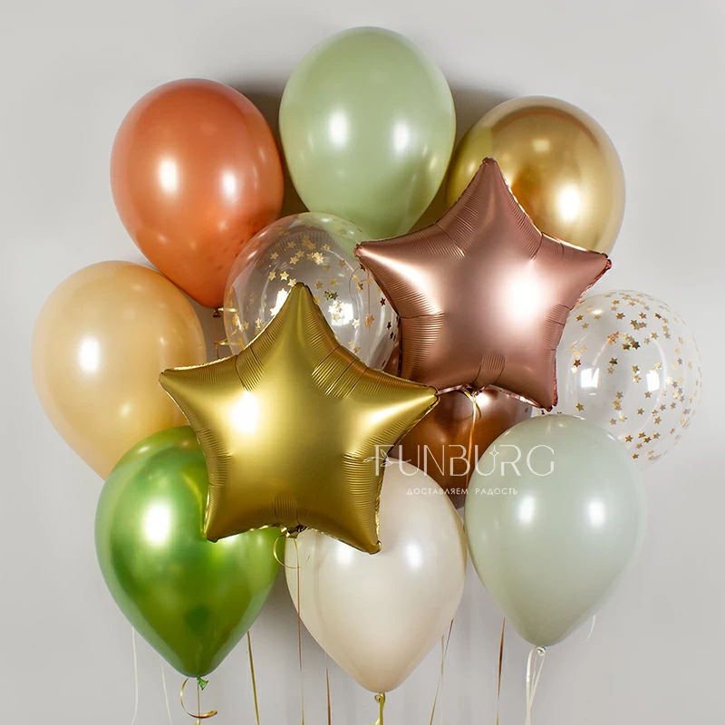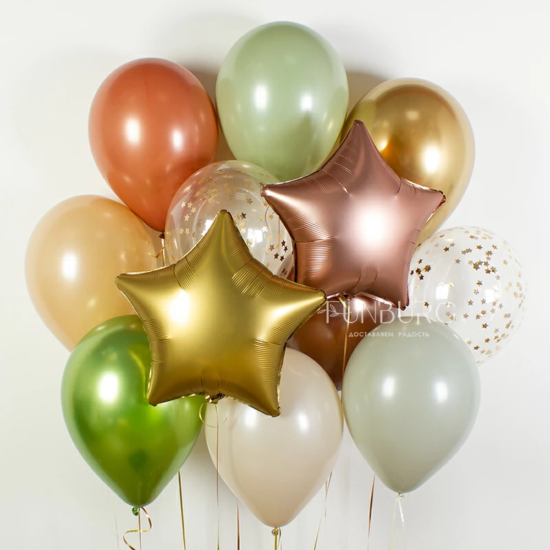 Сдержанное сложное сочетание природных зеленых, землистых и бежевых оттенков с добавлением благородного блеска шариков Chrome, матовых золотых звезд в шариках с конфетти и сатиновых звезд из фольги.