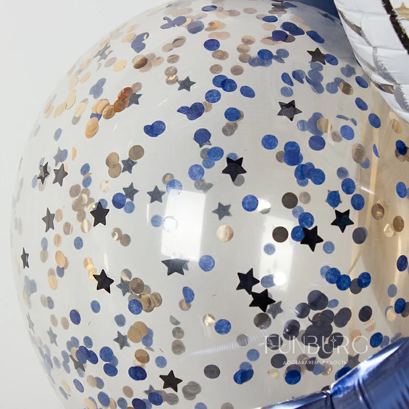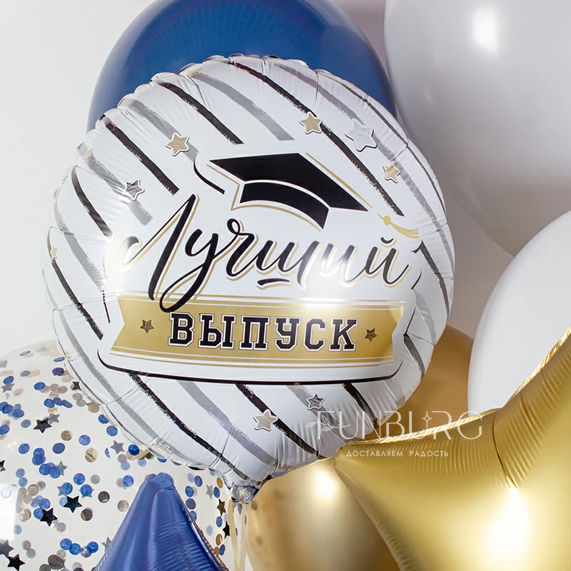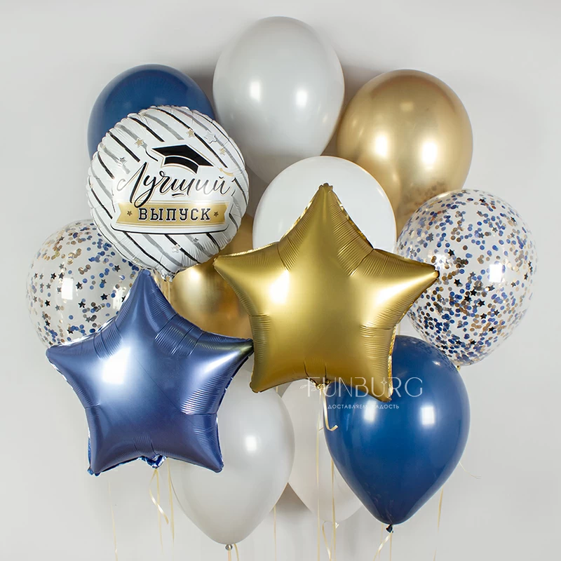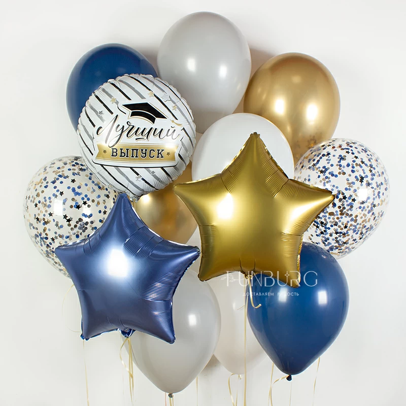 Лаконичный и сдержанный, контрастный, в меру серьезный и праздничный, с говорящим за себя шариком и сатиновыми звездочками в цвет, этот набор идеален для украшения выпускного самого лучшего выпуска!