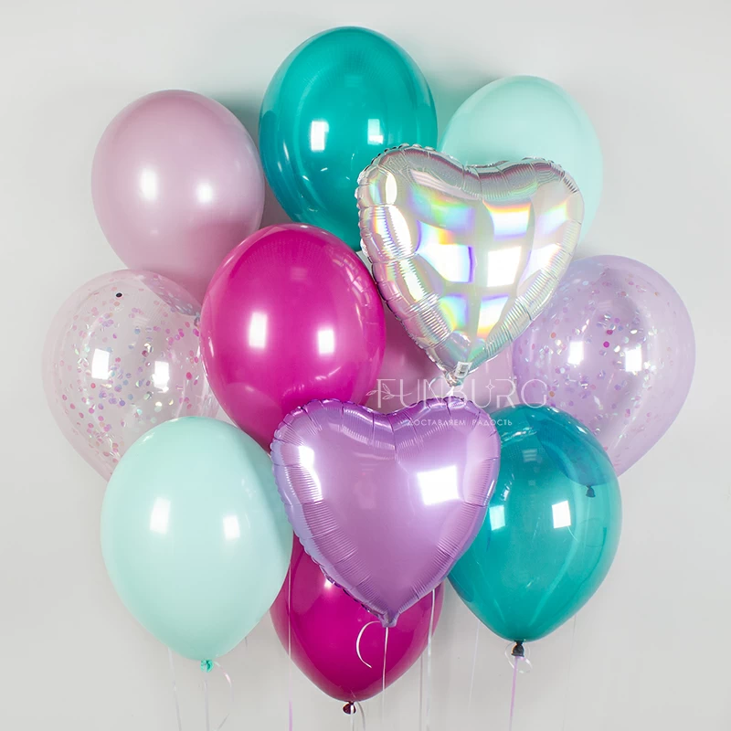 Волшебное сочетание оттенков сиреневого и бирюзового, дополненное переливами и мерцанием перламутровых конфетти и сердца, напоминают о сказках, феях, русалочке и чудесах. Набор доступен в более ярком и контрастном варианте (с виноградными шариками) и более нежном, где яркий лиловый оттенок заменяет пастельный сиреневый.