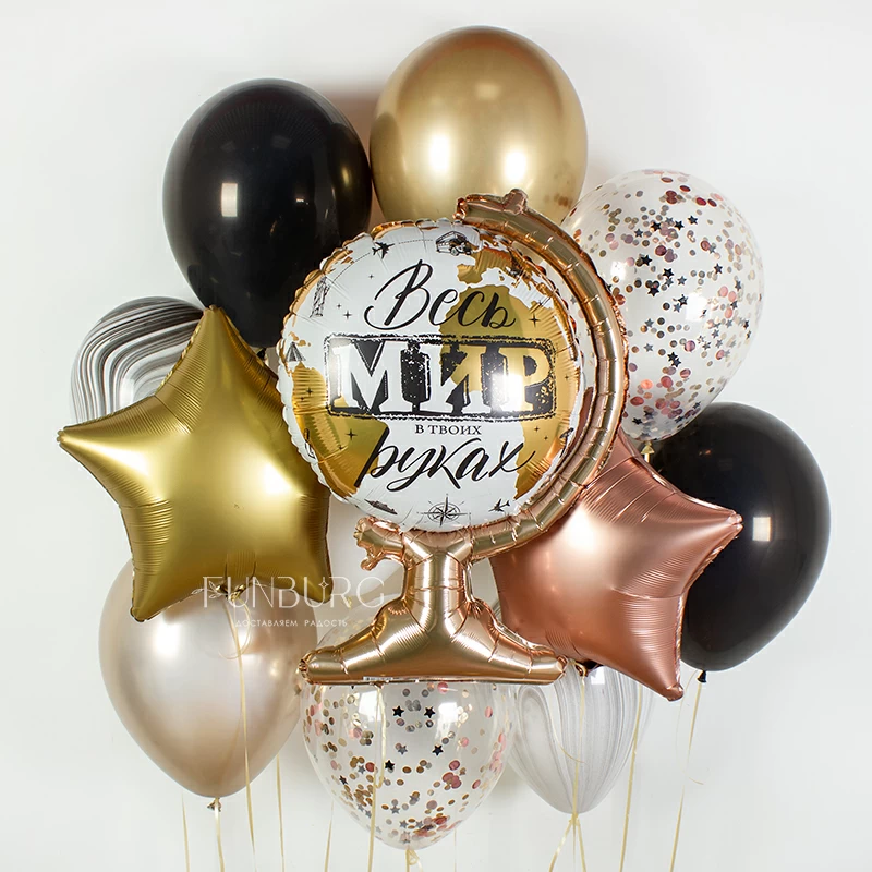 Классическая гамма с необычными акцентами шар в форме глобуса с вдохновляющей надписью отлично подойдет для украшения выпускного, подарка тому, у кого большие планы по покорению мира и знакомству с его чудесами!