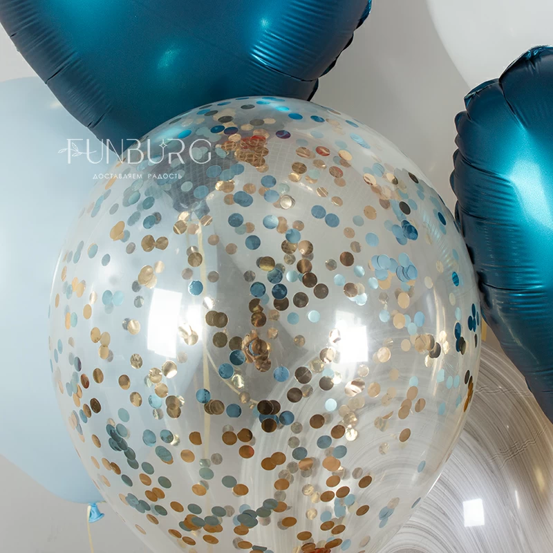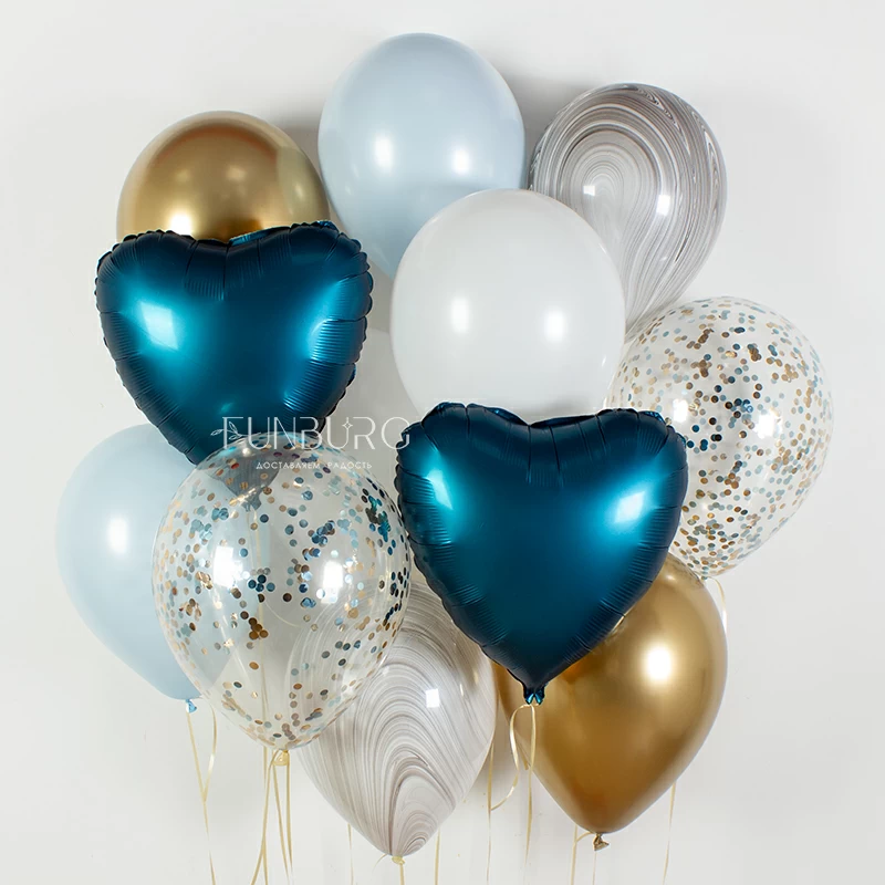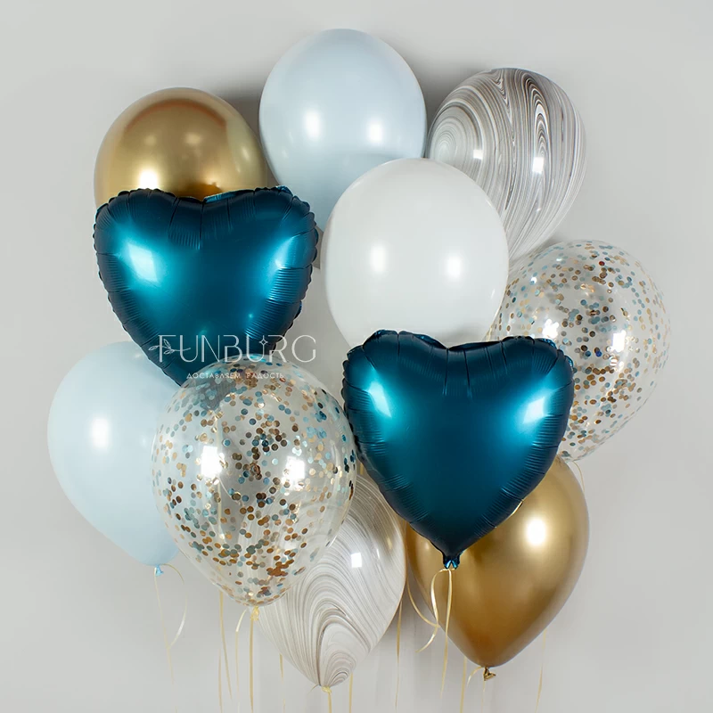 Сердца невероятно красивого глубокого оттенка «Индиго» настолько самодостаточны и выразительны, что мы решили оттенить их более приглушенными оттенками, которые бы подчеркнули их красоту: нежно-голубым, близким по тону, черно-белыми переливами «агатов», белым, мерцающим золотом и поблескивающими конфетти похожего голубого и приглушенного золотого оттенка. Кажется, получилось очень свежо, гармонично и притягательно.