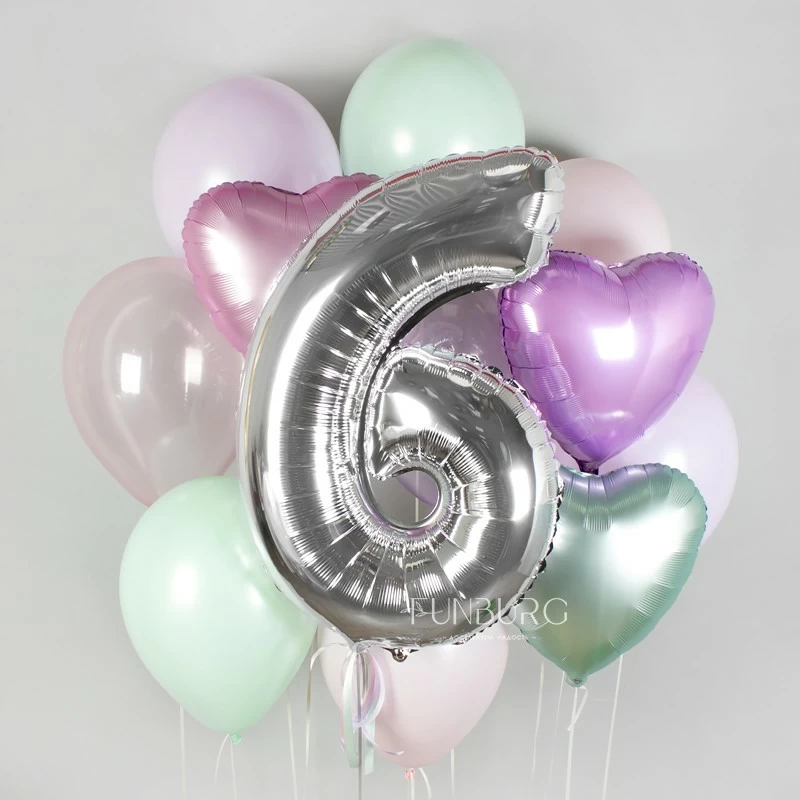 Небольшой и чрезвычайно нежный и воздушный набор оттенков душистой сирени, усыпанной поблескивающими капельками хрустальной утренней росы. Дополнили его миниатюрной версией цифры, декорированной ленточками в тон. Цифру можно сделать любой.