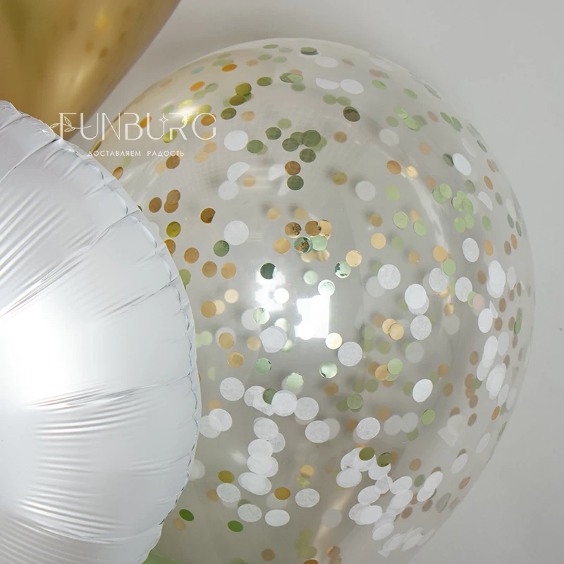 Стильный набор для празднования побед и самого заслуженного успеха! В нем сияющий золотой кубок обрамлен белыми, песочными, золотыми и шариками цвета листьев в лавровом венке победителя, сатиновыми кругами, напоминающими медали и шариками с конфетти в тон! Для всех, кто для вас №1!