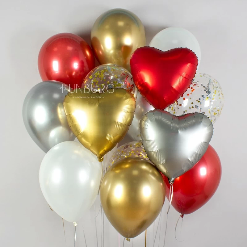 Сатиновые сердца клубнично-красного, золотого и платинового цветов, сияющие густым золотым блеском шарики Chrome, переливы серебряных и золотых конфетти и уравновешивающие эти сложные оттенки белые шарики. Если бы настоящую, сильную, вечную любовь нужно было нарисовать шариками, мы бы выбрали такое сложное, но очень гармоничное сочетание.