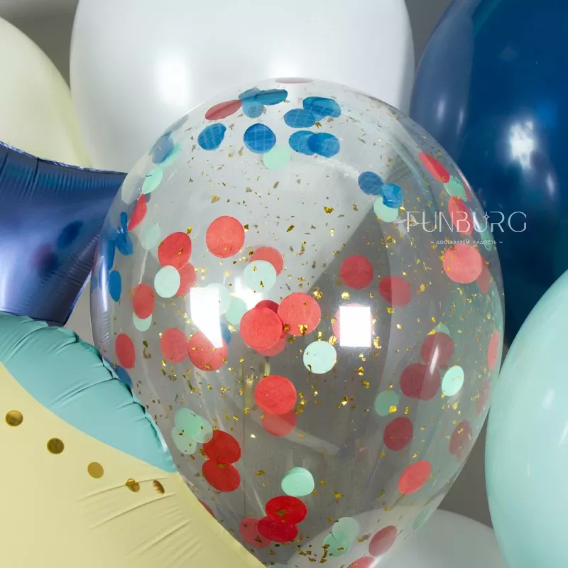 Необычный набор немного в ретро стиле с красивым винтажным самолетом, окруженным шариками, одновременно похожими на вечернее небо в облаках и дополняющими расцветку самолета. Красиво, нестандартно, ярко, сдержанно, идеально.