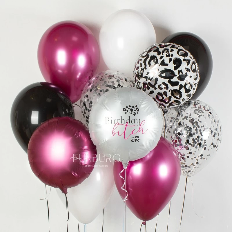 Для дерзкой, смелой, яркой, необычной и с чувством юмора, этот набор шариков идеален для девушки, которой присущи все эти качества! А с надписью как на нашем примере – особенно, но только убедитесь, что получательница оценит ваш юмор, а не затаит на вас обиду 😉 В любом случае, надпись на шаре мы можем сделать любой (а оформление сохраним), или вовсе ее убрать – состав набора вы всегда можете менять, как захочется!