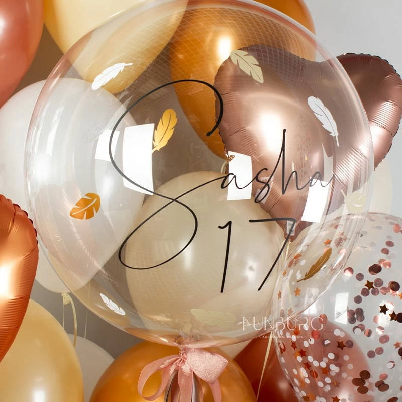 На кристально-прозрачный шар Bubble с шлейфом из разнофактурных лент можно добавить любую надпись (укажите нужную надпись в комментарии к заказу или скажите менеджеру при подтверждении заказа).